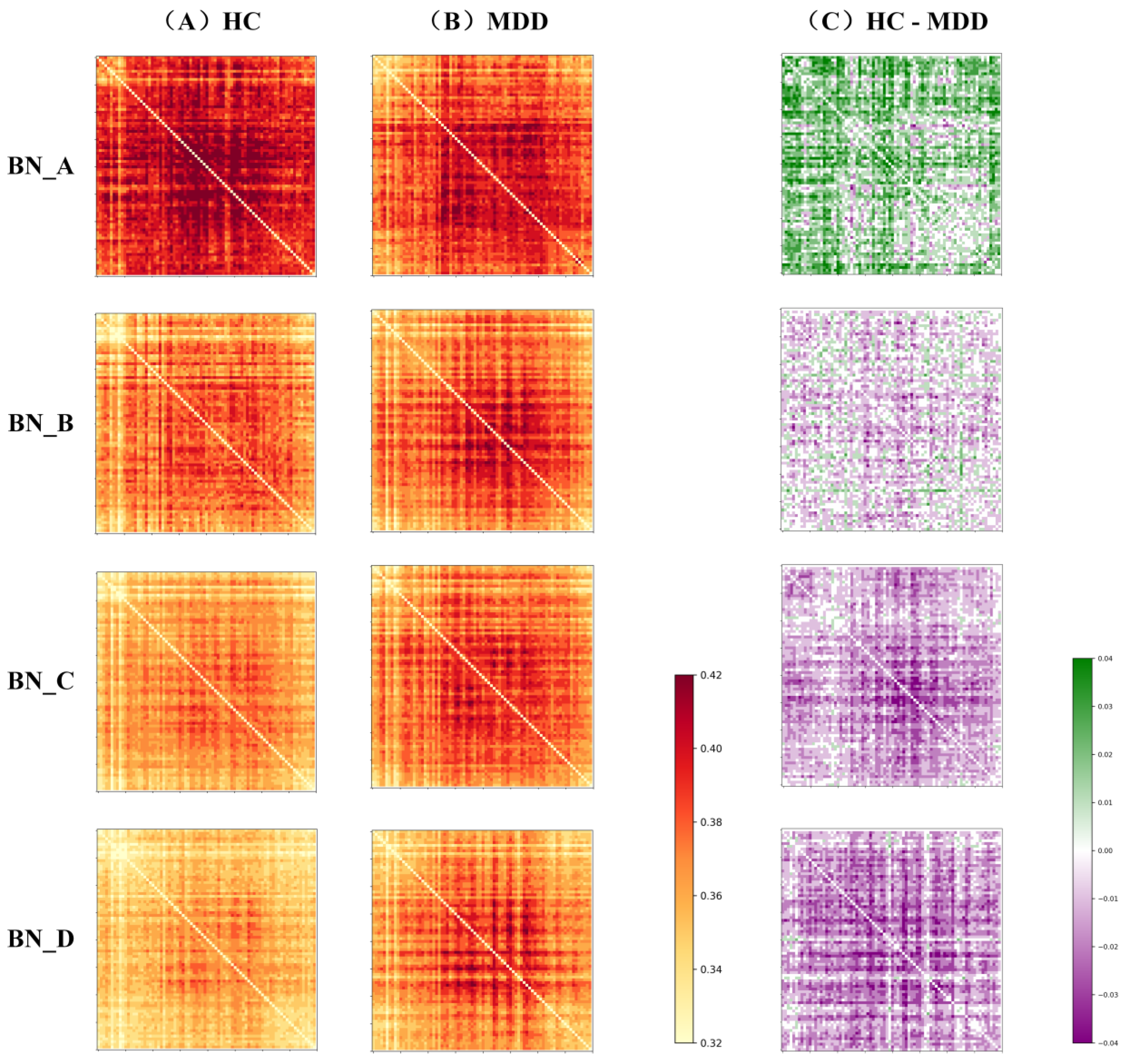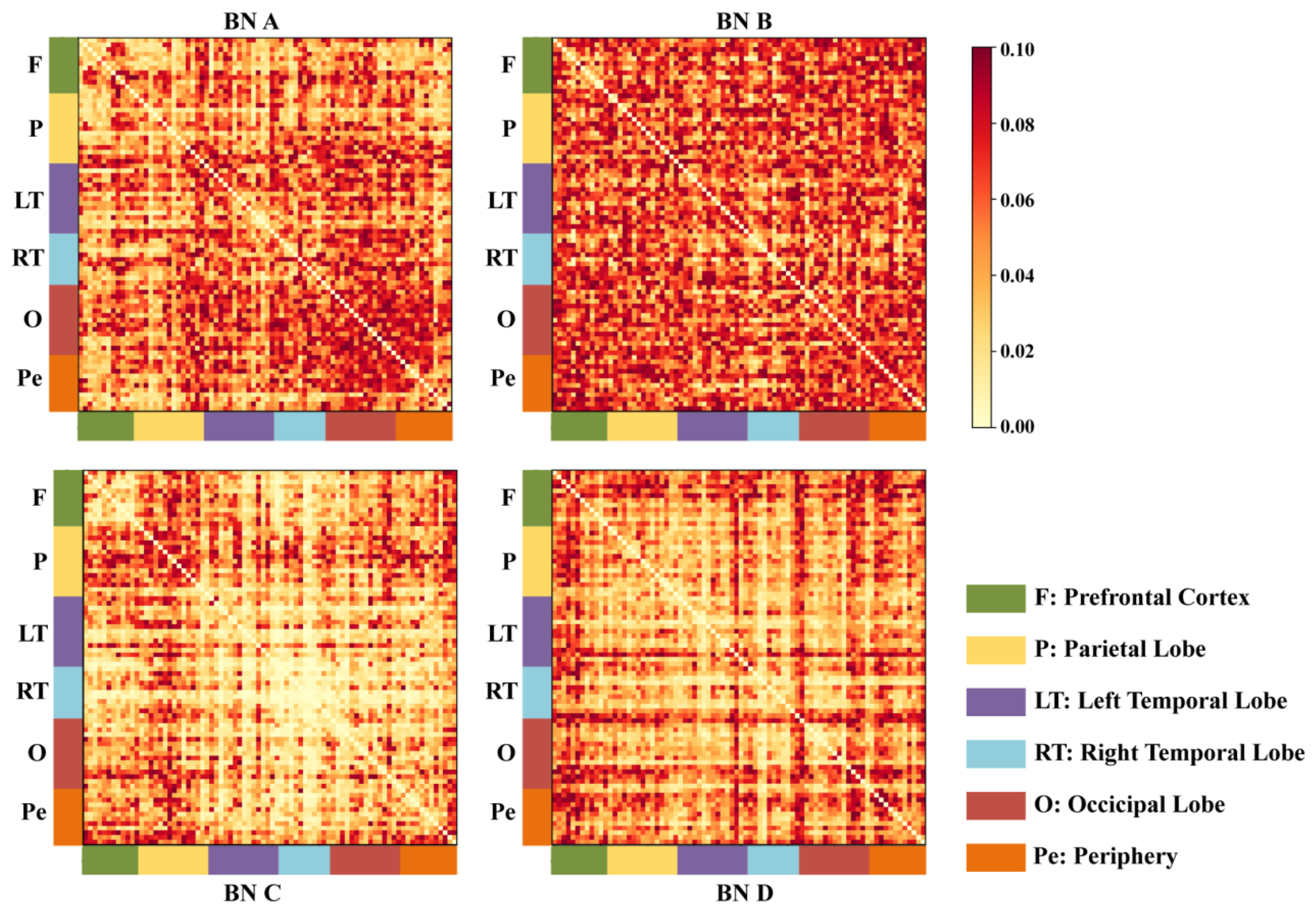Based on the results of microstate segmentation, the EEG signals of each subject were segmented according to microstates A to D, and the corresponding 80 × 80 functional connectivity matrices were constructed using the PLV method, which were denoted as BN_A, BN_B, BN_C, and BN_D, respectively.