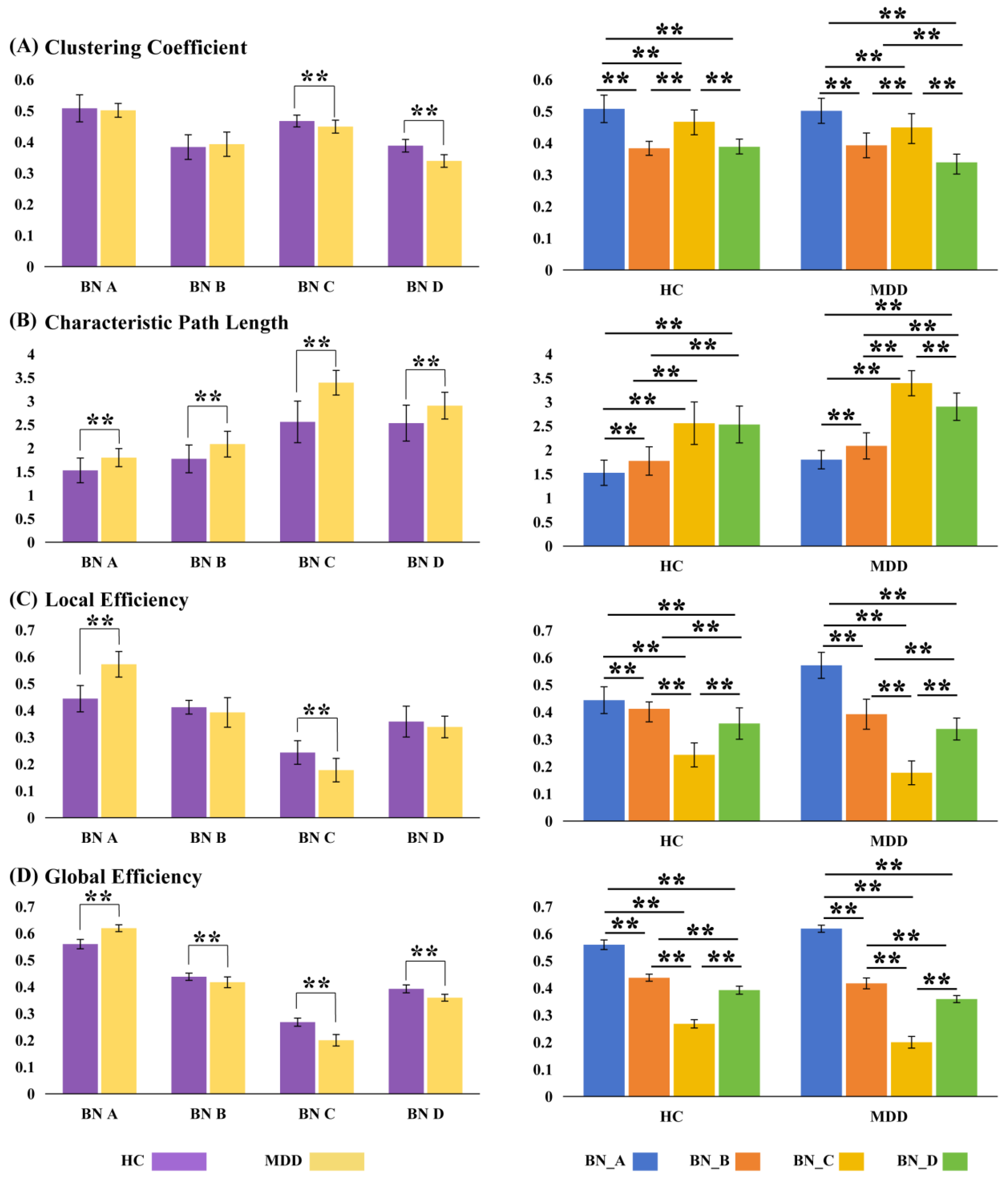 Figure 8, statistical analyses were performed to compare the topological properties of brain functional networks between the HC and MDD groups. The results revealed significant alterations in BN_C among MDD patients. Specifically, the clustering coefficient was significantly reduced (HC: 0.4672 ± 0.0190 vs. MDD: 0.4492 ± 0.0208, t = 3.284,