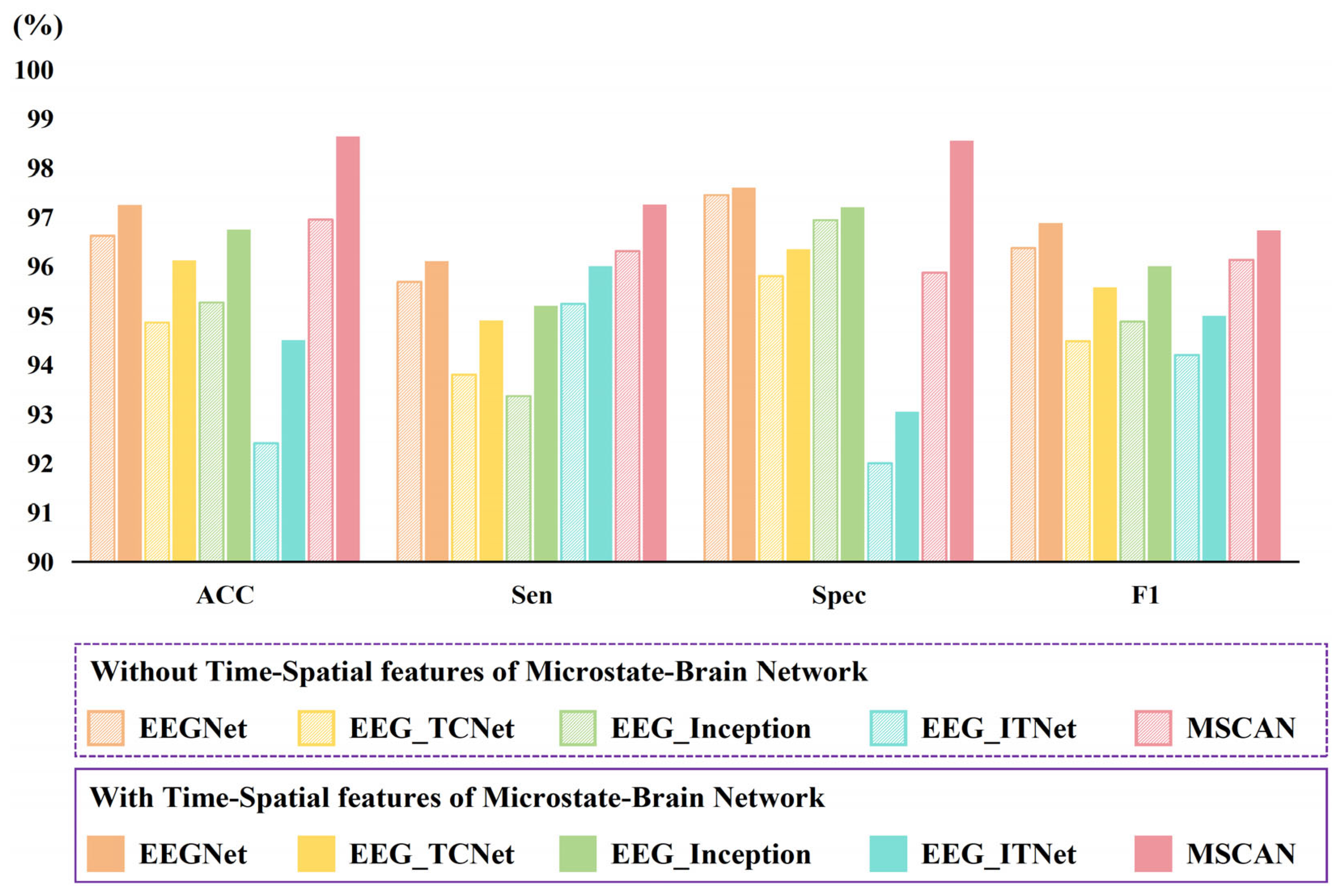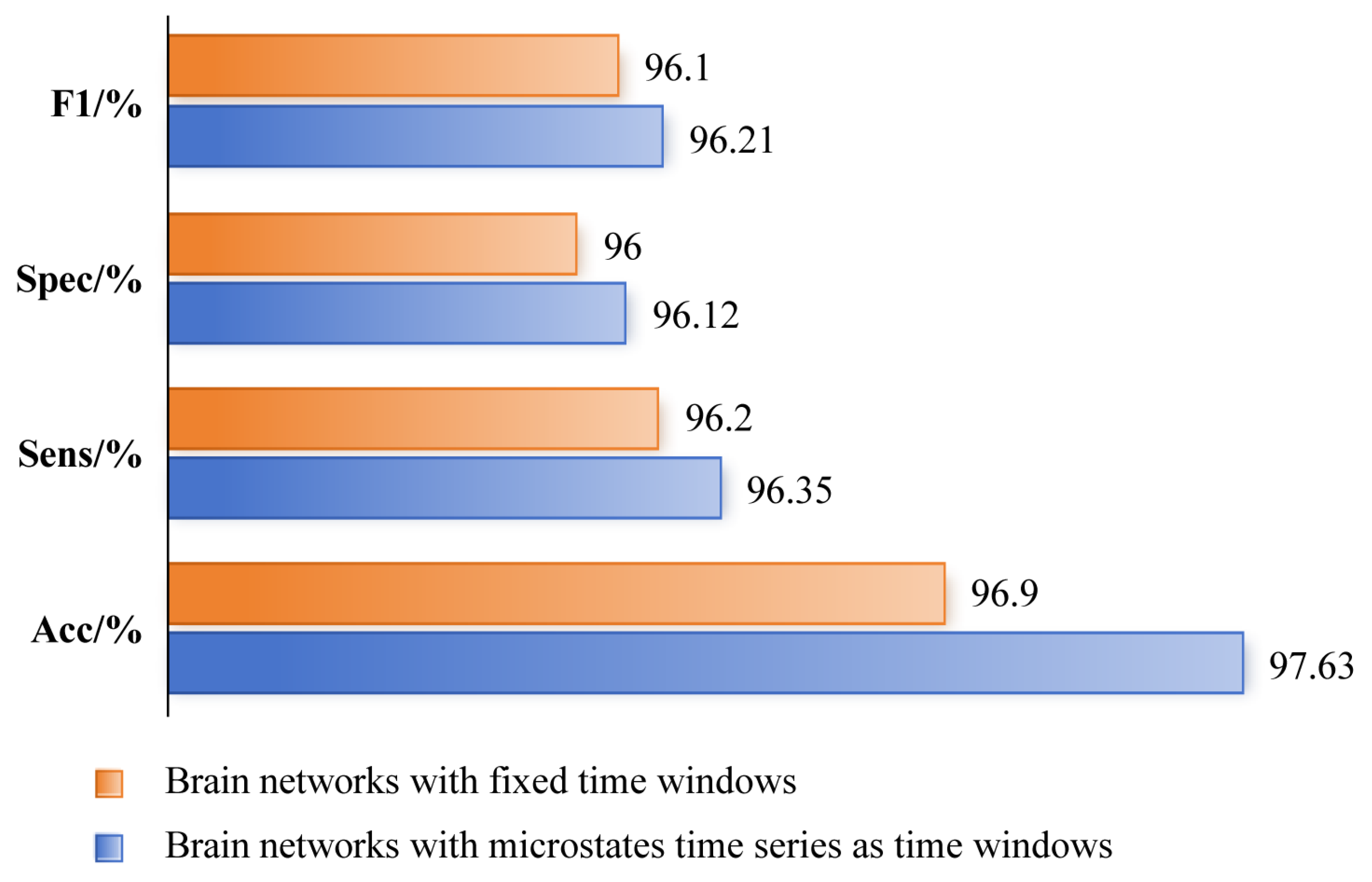 Figure 9. The results showed that the Accuracy, Sensitivity, Specificity, and F1-score of the MSCAN model for the diagnosis of depression reached 97.63%, 96.35%, 96.12%, and 96.21%, respectively, when the brain network constructed based on microstate time series was used as a feature. Compared to the brain network constructed based on fixed time windows as a feature, the depression diagnosis results were improved, indicating that the brain network constructed based on the microstate time series could characterize the brain functional connectivity features of depression more effectively.