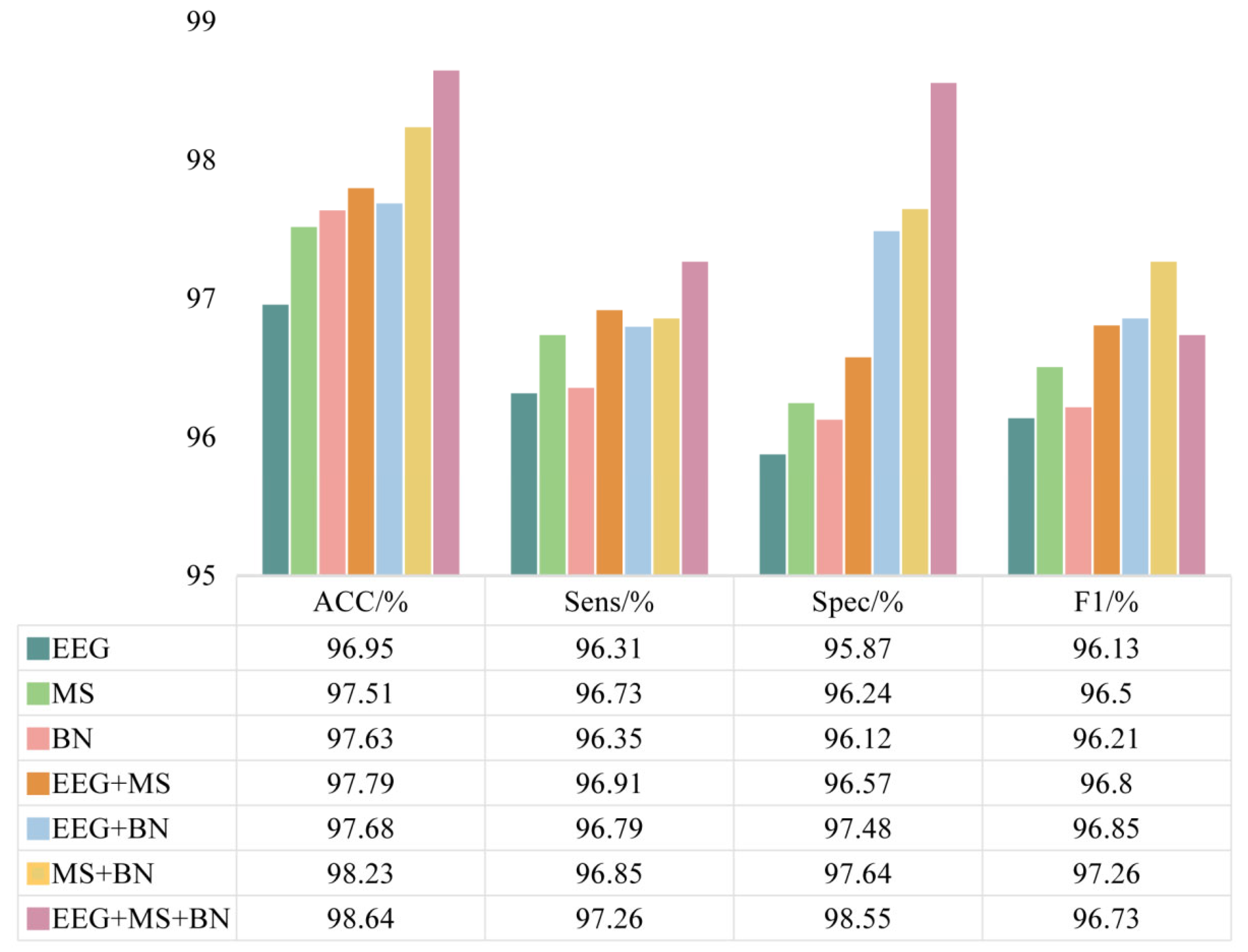 From the experimental results, it can be observed that the model performance is relatively low for a single modal input. The recognition accuracy based on EEG data was 96.95%, sensitivity was 96.31%, specificity was 95.87%, and F1 score was 96.13%. In contrast, microstate parameter-based and brain network features outperformed EEG data in some of the metrics, with microstate parameter-based diagnosis reaching 97.51% and 96.73% in terms of accuracy and sensitivity, respectively, and brain network feature-based diagnosis reaching 96.12% and 96.21% in terms of specificity and F1 score. The recognition performance improved when both sets of modal data were used simultaneously. The combination of EEG data with microstate features increased the accuracy to 98.23%, while the combination of EEG data with brain network features improved the specificity to 97.48%. In addition, the combination of microstate features and brain network features reached 97.26% in terms of F1 score. The overall recognition performance of the MSCAN model was optimized when the EEG data, microstate parameters, and brain network features were used simultaneously. The accuracy increased to 98.64%, the sensitivity reached 97.26%, the specificity increased to 98.55%, and the F1 score reached 96.73%. These results indicate that all three modal data, EEG data, microstate parameters, and brain network features contribute to different degrees to the recognition of depression in the MSCAN model, and that the brain activity features integrating multiple modal data improve the recognition of depression.