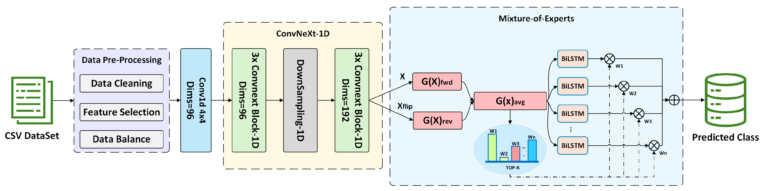 - In terms of base model design, ConvNeXt is effectively combined with a Sparse MoEs framework to form an integrated model that unifies feature extraction and expert decision-making. ConvNeXt is employed to automatically extract multi-scale, hierarchical spatial features from network traffic data, thereby improving the efficiency and accuracy of recognizing complex attack patterns. On this basis, the Sparse MoEs architecture aggregates multiple parallel BiLSTM experts to capture sequence-level dependencies among ordered features.