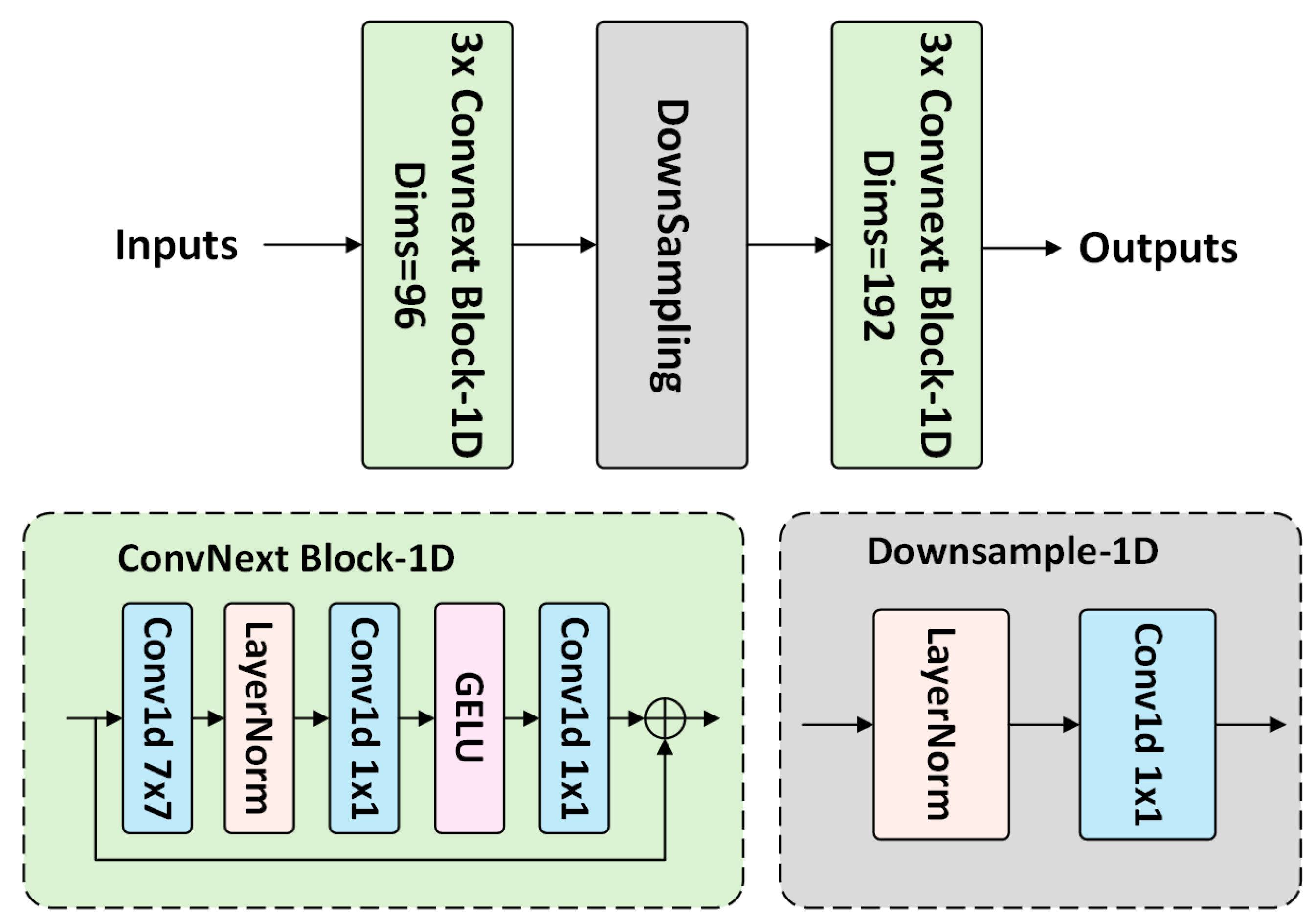 - Complexity analysis of the ConvNeXt-1D feature extraction module:The ConvNeXt-1D feature extraction network begins with a stem layer for initial representation learning, implemented using a 1D convolution with a kernel size of . This layer takes a single input channel and outputs channels. With a stride of , the input sequence length is downsampled to at this stage. Accordingly, the parameter count and computational cost (FLOPs) of the stem module are given in Equations (15) and (16), respectively.In the ConvNeXt Block-1D, let the input channel dimension be d. This block comprises a 1D depthwise convolution with kernel size k (with groups ), a LayerNorm (LN) layer, two pointwise convolutions with channel mappings and , and a learnable scaling factor . The corresponding parameter count and FLOPs are given in Equations (17) and (18), respectively.The ConvNeXt-1D network consists of multiple stages. For the s-th stage, let the channel width be , the number of ConvNeXt Block-1D units be , and the input sequence length be . Then, the parameter count and computational cost (FLOPs) of this stage are given in Equations (19) and (20), respectively.A Downsample-1D module is inserted between adjacent stages to perform channel transition and sequence downsampling. Let its input and output channels be and , respectively, with a kernel size of 2, and the output sequence length satisfies . Then, the parameter count and computational cost (FLOPs) of the Downsample-1D module are given by Equations (21) and (22), respectively.Therefore, assuming that the ConvNeXt-1D feature extraction network contains S stages, its total number of parameters is given by Equation (12), where the final output normalization LayerNorm contributes learnable parameters. The corresponding total computational cost (FLOPs) is given by Equation (13). Note that the FLOPs of the output normalization are typically negligible compared with those of the convolutional backbone and the expert modules and are thus omitted in standard complexity accounting.