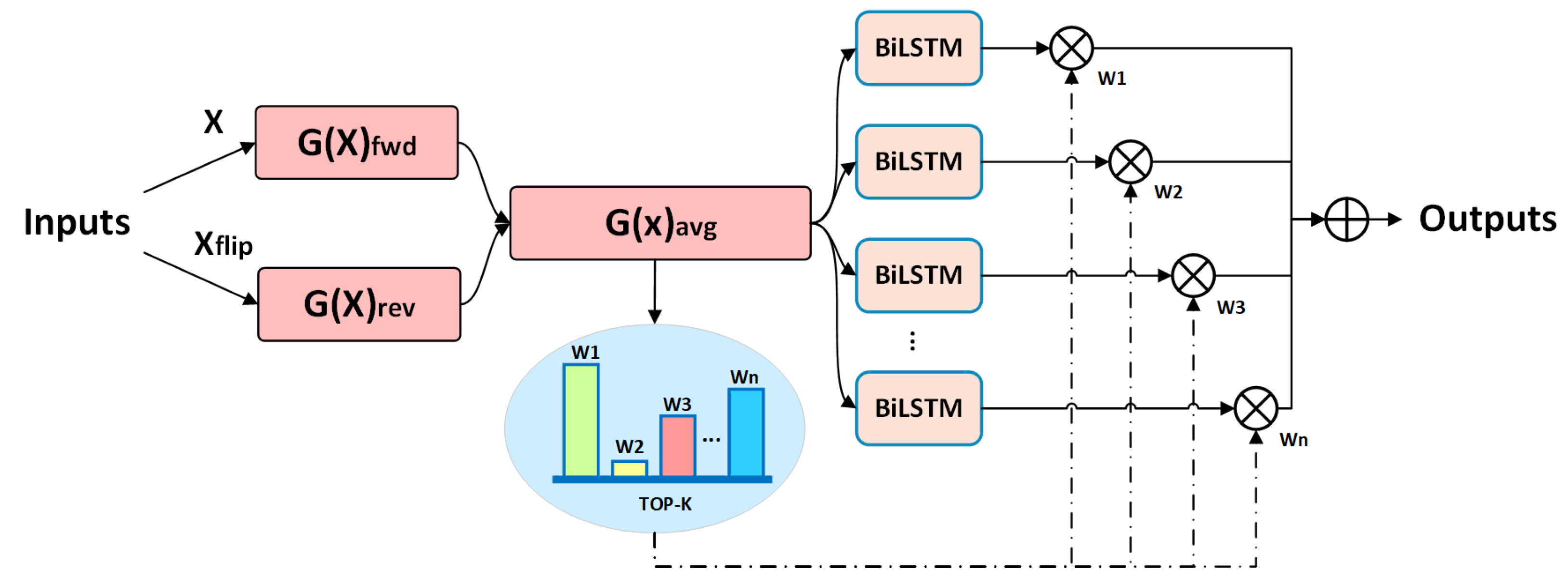 - Complexity analysis of the sparse mixture-of-experts module:First, for the gating linear layer (Gate), let the input feature dimension be , and the number of experts be M. Then, the parameter count and computational cost (FLOPs) of the gate are given by Equations (25) and (26), respectively.For a single BiLSTM expert, let the input feature dimension be , the sequence length be , the hidden size be H, and the number of layers be 1. Then, the parameter count and computational cost (FLOPs) of this expert are given by Equations (27) and (28), respectively.The classification head is implemented as a linear layer with input dimension , which maps the features to classes. Its parameter count and computational cost (FLOPs) are given by Equations (29) and (30), respectively.Although the model contains M experts, under the Top-K sparse routing mechanism, only K experts are activated for each sample during the forward pass. Therefore, the parameter count and computational cost (FLOPs) of the Sparse MoEs module are given by Equations (31) and (32), respectively.Therefore, the total parameter count and FLOPs of the model during inference are given by Equations (33) and (34), respectively. It can be observed that Sparse MoEs module increases conditional capacity by introducing more experts, while the inference time computational cost is mainly governed by the Top-K value K. During training, the proposed symmetric gating requires an additional forward pass through the backbone and averages the forward and reverse gating probabilities; during inference, only the forward gate is used, and thus the inference FLOPs do not increase.Overall, the computational cost of the proposed model is mainly dominated by two parts: (i) the pointwise and downsampling convolutions in the ConvNeXt-1D backbone and (ii) the BiLSTM expert computations in the Sparse MoEs module over the output sequence length . In contrast, operations such as global average pooling, LayerNorm, GELU, softmax, and Top-K selection are typically non-dominant and are thus treated approximately in the FLOPs accounting (reported using “≈”). Notably, Sparse MoEs increases the parameter count with the number of experts M to enhance capacity, while the inference time computation is primarily governed by the Top-K value K, enabling performance gains under a bounded inference budget. Moreover, the proposed symmetric linear gating mainly increases training time cost but introduces negligible overhead during inference.