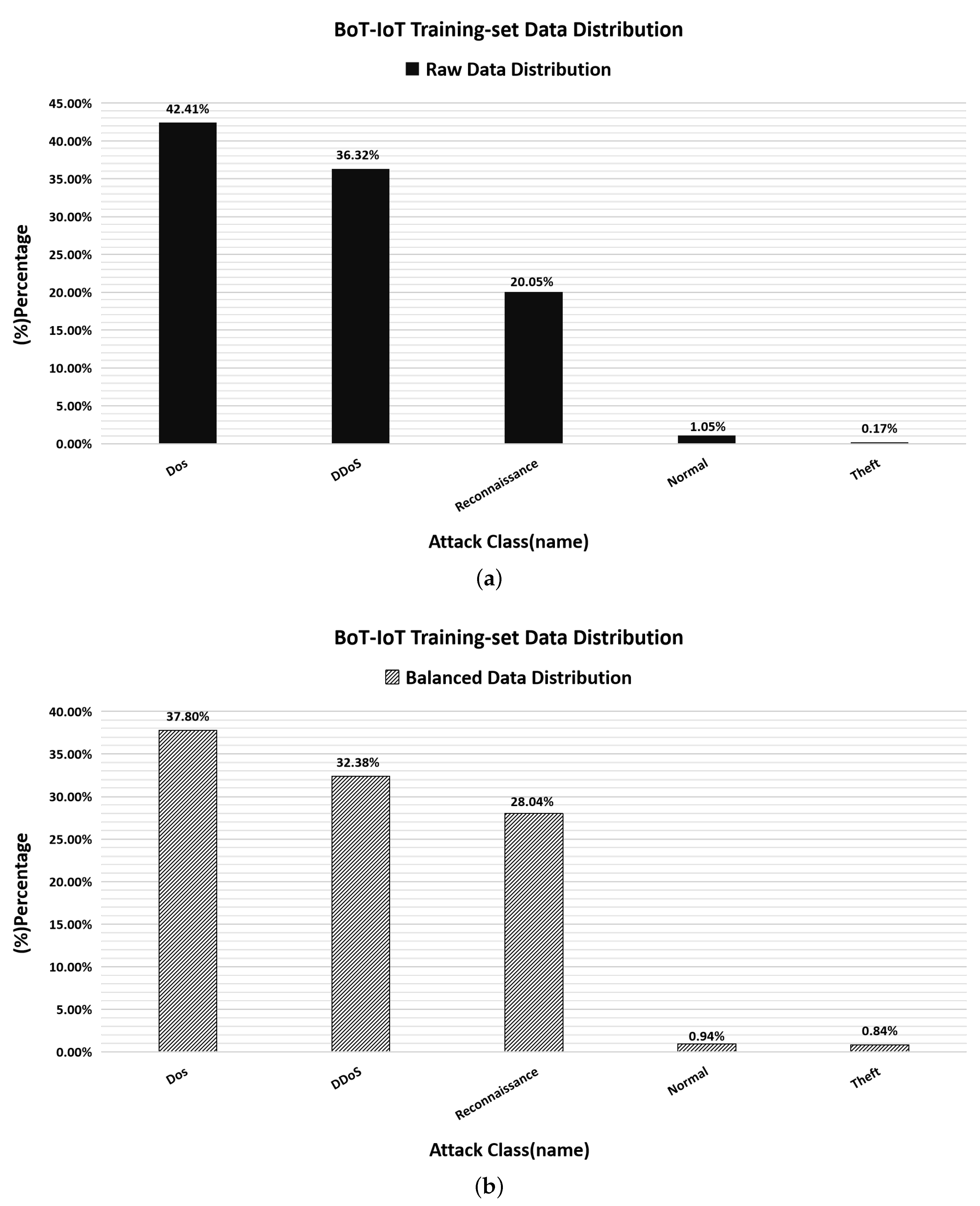 - To address the asymmetric class distribution in IoT intrusion datasets, we integrate random undersampling with SMOTE–Tomek oversampling. This strategy enhances the representation of minority classes while preserving high recognition rates for majority classes, thereby improving class balance, boosting overall accuracy, and alleviating bias induced by data imbalance.