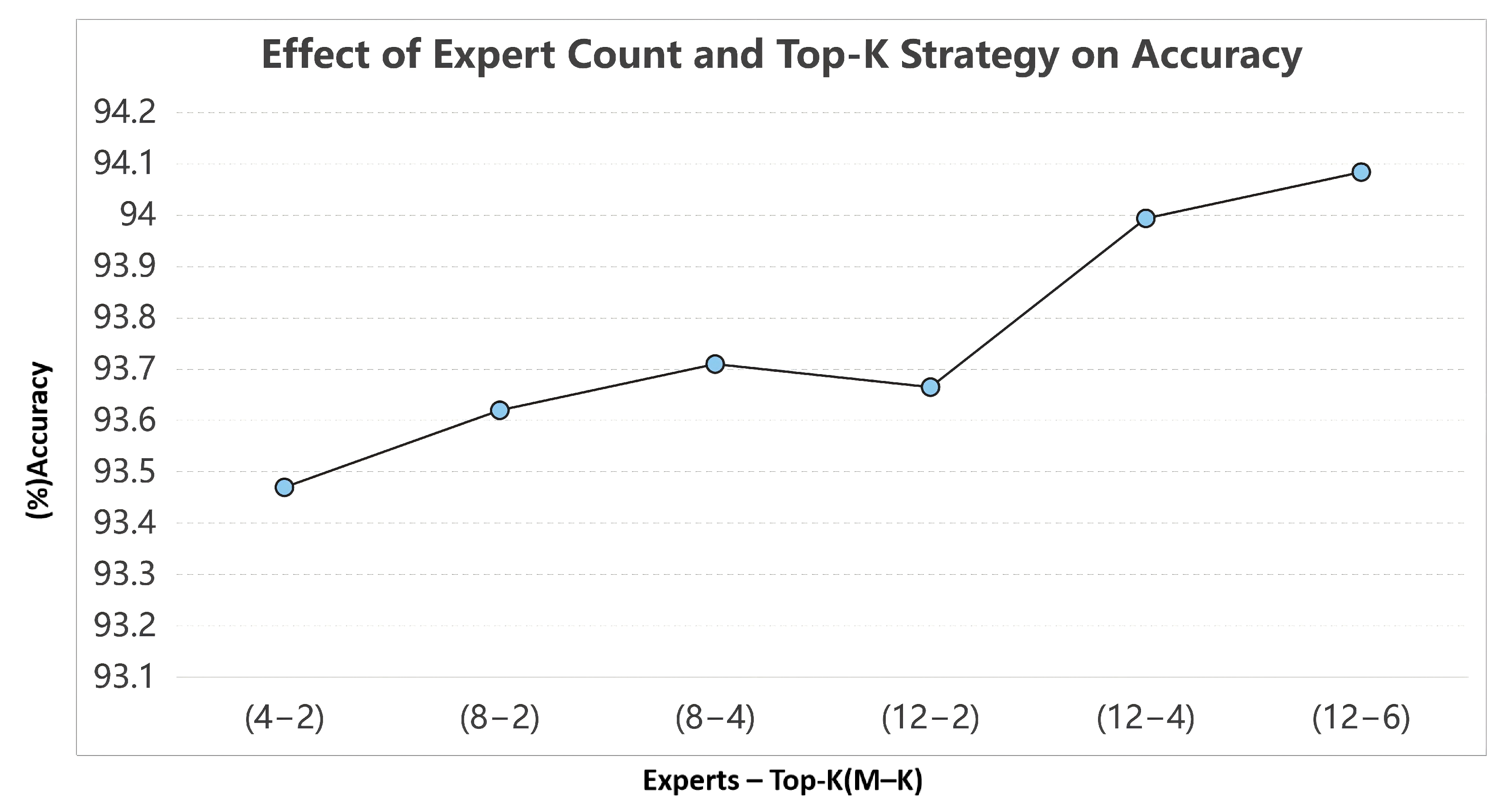 - For IoT network intrusion detection scenarios, we introduce a symmetric linear routing mechanism into the gating network, which effectively mitigates the strong perturbation sensitivity of routing gates and the expert load imbalance commonly observed in conventional MoE models. This design enables efficient collaborative inference among multiple experts and leads to improved classification accuracy in the final decision.