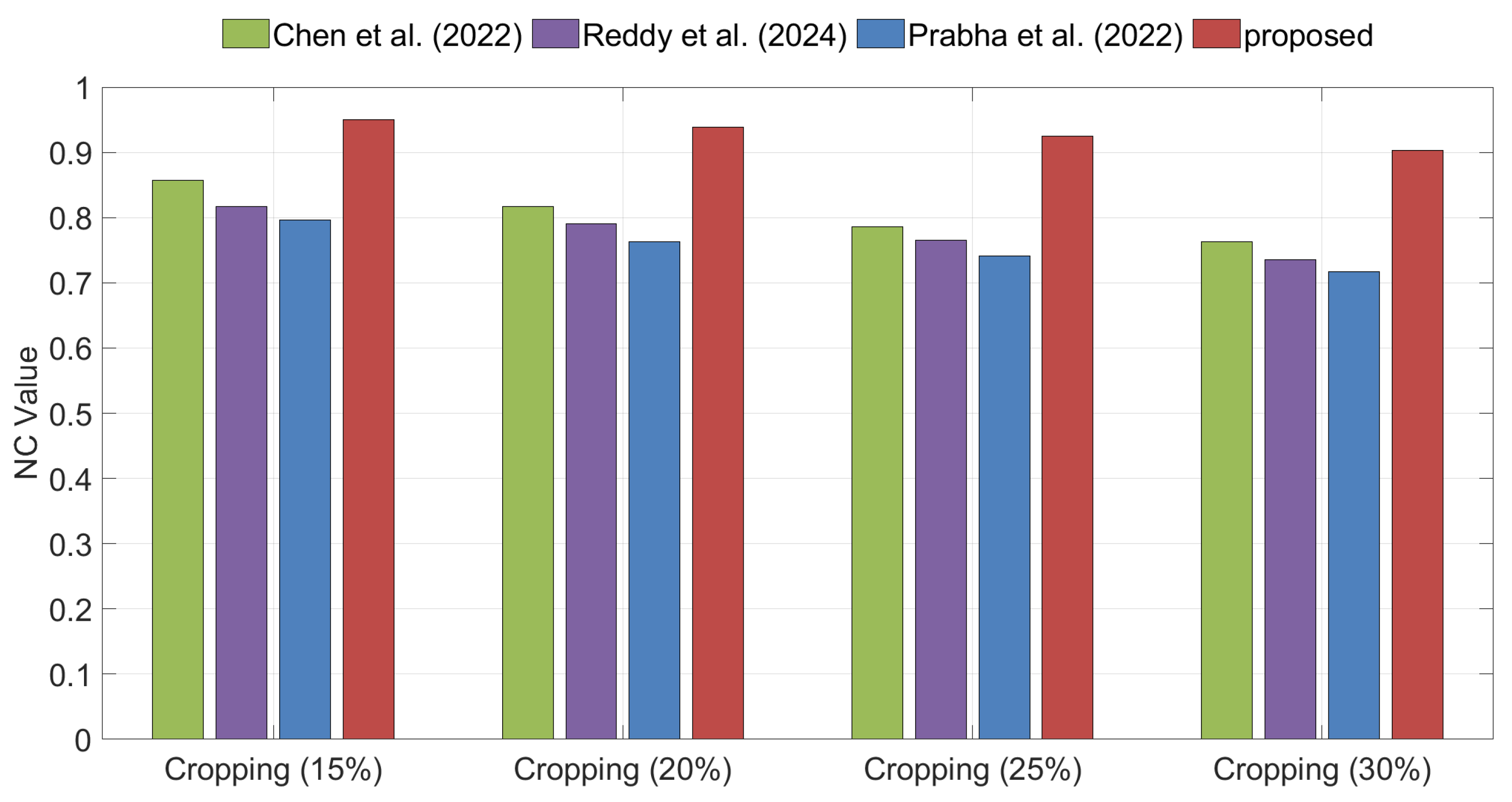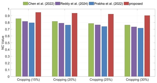 Figure 12 illustrates the NC values of the extracted watermarks for different algorithms under cropping attacks. The experimental results demonstrate that the proposed method achieves significantly higher NC values than other methods.