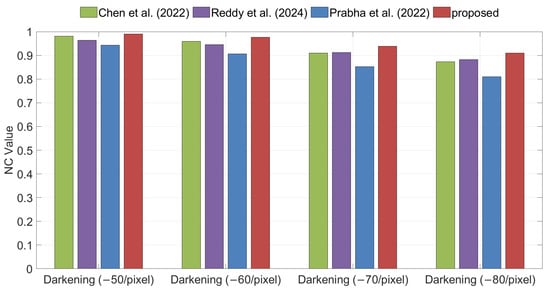 . The value of NC closer to 1 indicates that the watermark has been accurately and completely extracted, reflecting strong resistance to attacks. The NC is defined as shown in Equation (