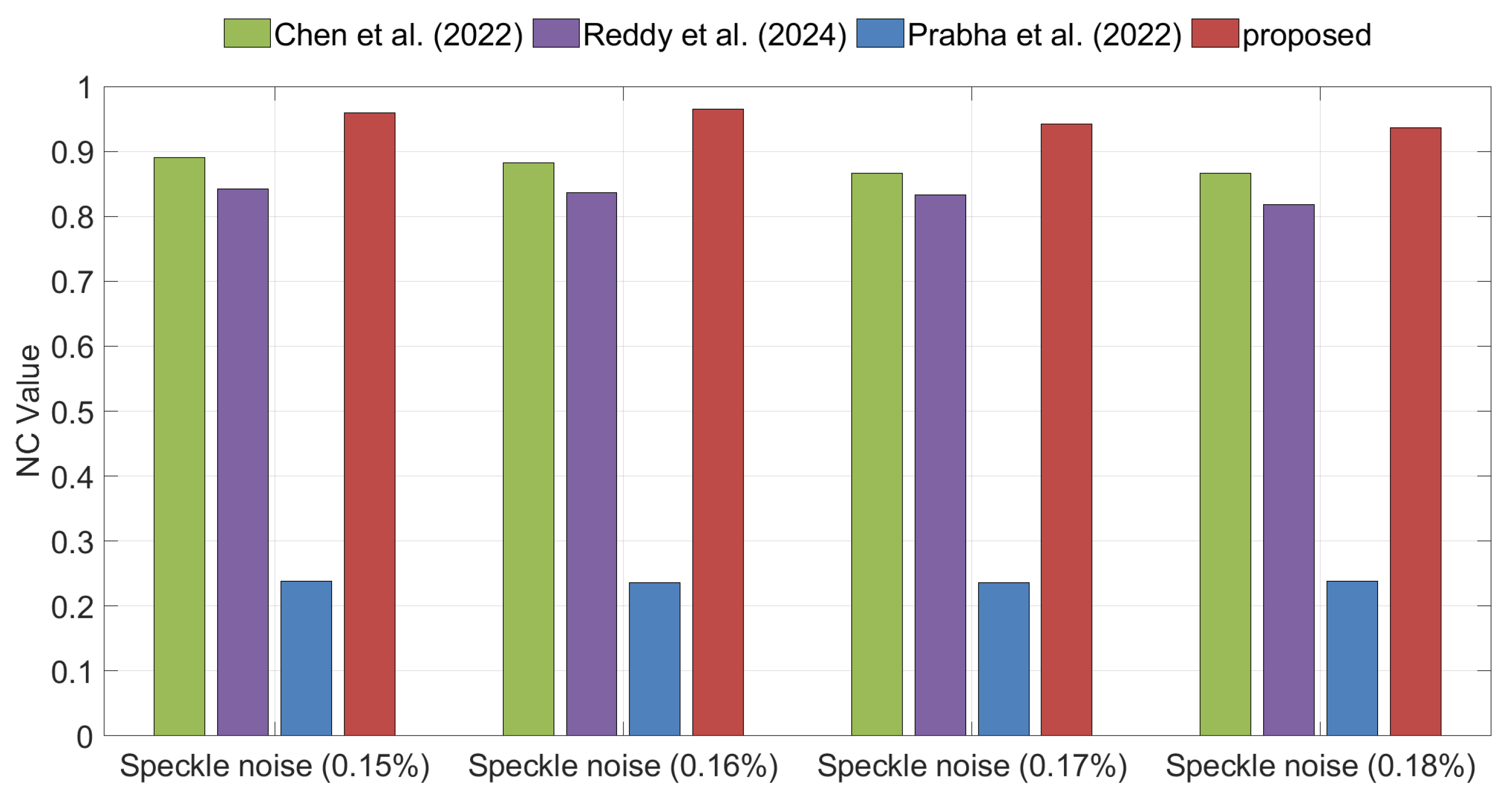 Figure 9 illustrate the NC values of the extracted watermarks under Gaussian and Speckle noise for different watermarking algorithms. The experimental results demonstrate that, under both types of noise attacks, the proposed method consistently achieves the highest NC values, indicating superior robustness compared with the benchmark methods.