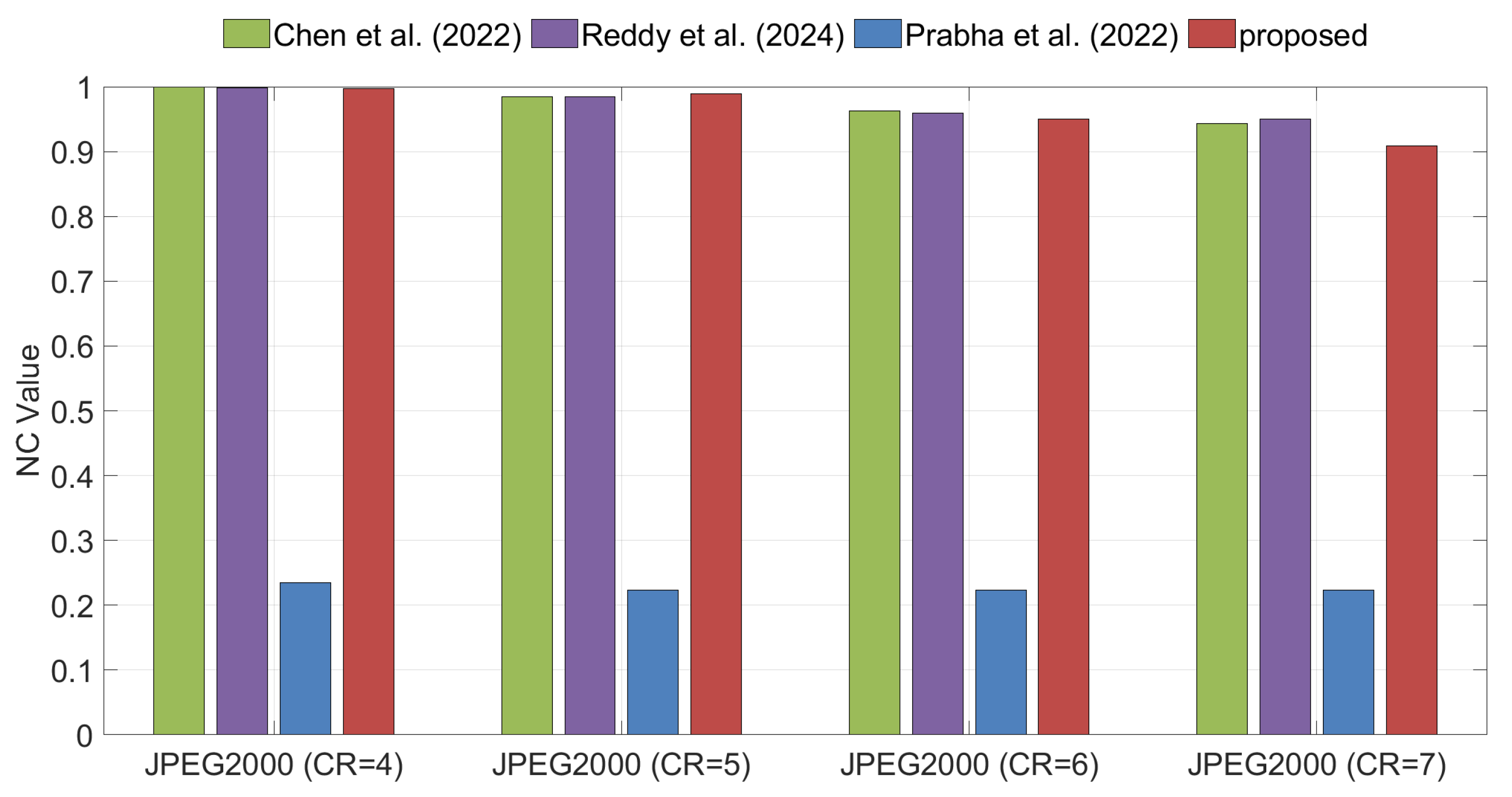 Figure 10 shows the NC values of the extracted watermarks under JPEG2000 compression for different watermarking algorithms. The results show that the proposed method yields slightly lower NC values compared with Algorithms [