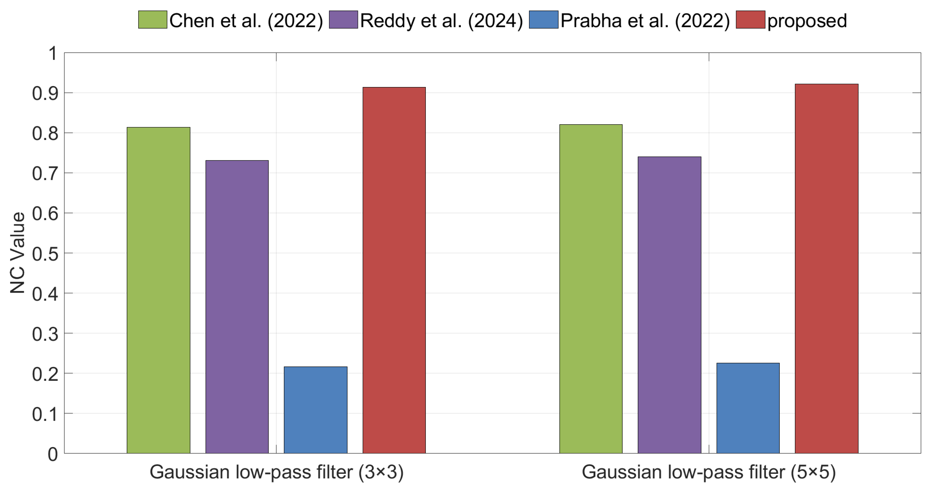 Figure 11 compares the NC values of the extracted watermarks for different algorithms under Gaussian low-pass filtering. The results show that the proposed method exhibits a clear performance advantage in this scenario, achieving higher NC values than the competing methods and thereby verifying its effectiveness against Gaussian low-pass filtering attacks.