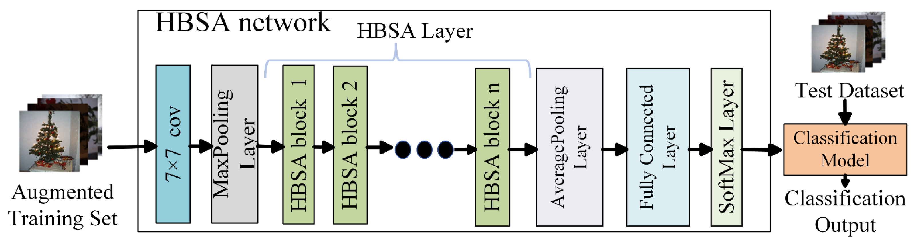 - HBSA Network. Finally, the extracted features and the augmented dataset are used to construct and train the HBSA network, which serves as the classification model. The HBSA network is composed of six layers, with the HBSA layer at its core. The HBSA layer repeatedly downsamples the feature maps while expanding the channel dimensions, thereby capturing higher-dimensional representations. The classification model is trained on the expanded dataset, and during inference, test samples are input into the trained HBSA network to produce the final predictions.