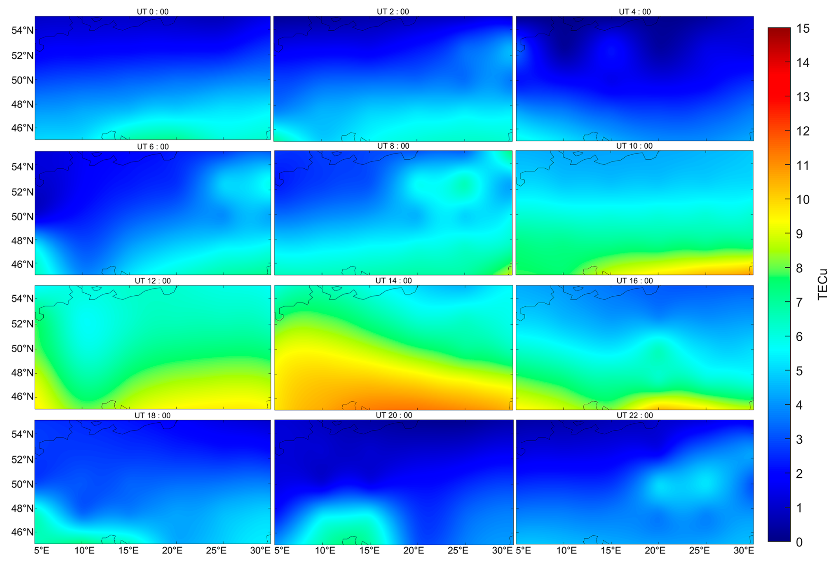 - Doğanalp, S.; Köz, İ. Investigating Different Interpolation Methods for High-Accuracy VTEC Analysis in Ionospheric Research. Atmosphere 2024, 15, 986. [Google Scholar] [CrossRef]
