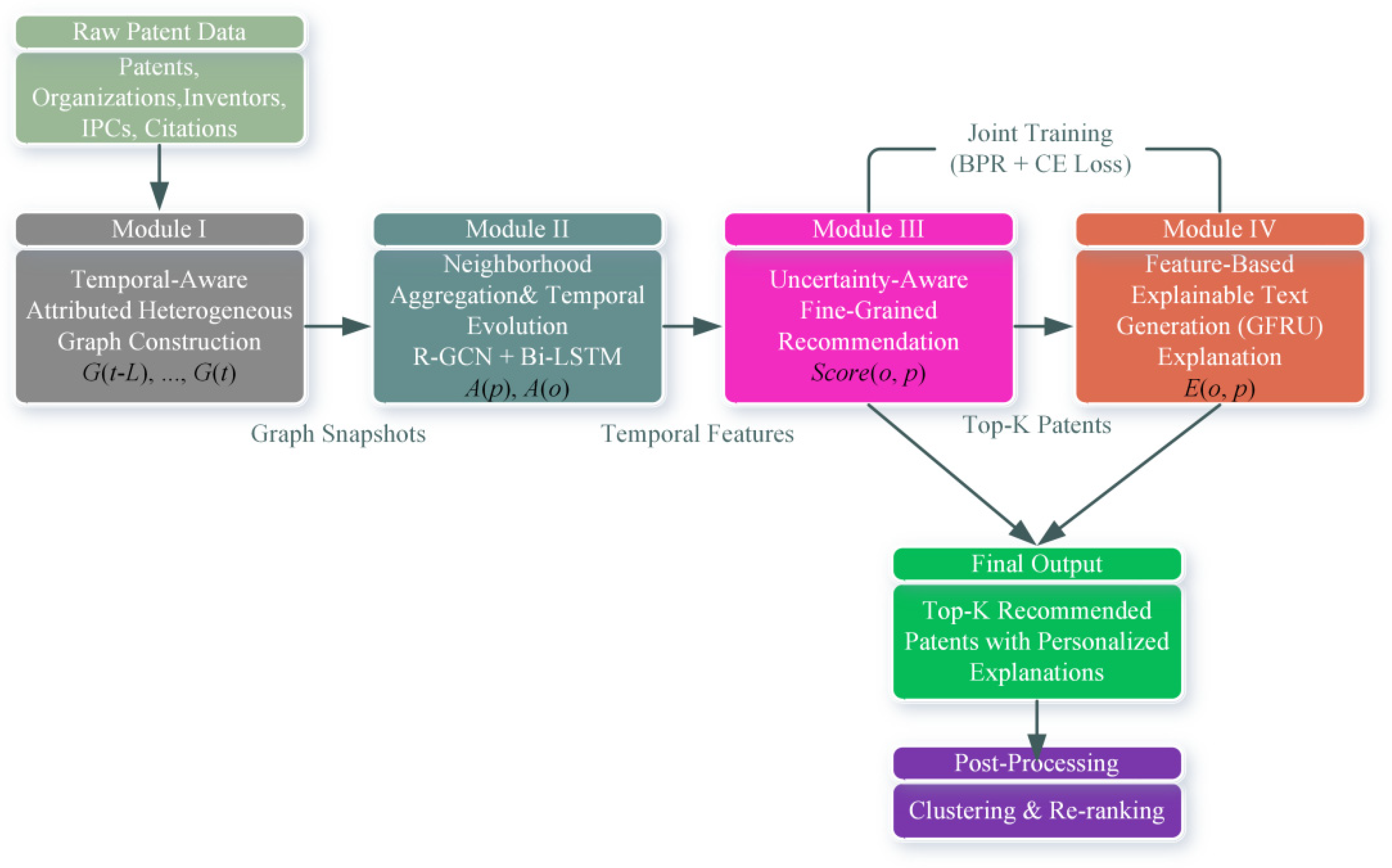 | 1: Initialize model parameters Θ 2: // Main training loop begins 3: for epoch = 1 to max_epochs do 4: // Recommendation Module Training 5: for each mini-batch in do 6: For each positive pair (o, p+), sample a negative patent p− to form triplets {(o, p+, p−)} 7: // Step 1: Extract Deterministic Features 8: Apply R-GCN to each graph snapshot in Gseq to get yearly node features {H(t)} 9: Use Bi-LSTM to extract temporal evolution features A(o), A(p+), A(p−) for all entities in the triplets 10: Aggregate fine-grained information via multi-head attention to get M(o), M(p+), M(p−) 11: Concatenate and fuse to compute the final deterministic feature representations I(o), I(p+), I(p−) 12: // Step 2: Generate Probabilistic Representations and Compute Scores 13: Project the deterministic features I(.) to Gaussian distribution parameters (μ(.),Σ(.)) 14: Calculate deterministic similarities simdet(o, p+) and simdet(o, p−) 15: Calculate probabilistic similarities simprob(o, p+) and simprob(o, p−) 16: Compute the final recommendation scores score(o, p+) and score(o, p−) 17: // Step 3: Compute Recommendation Loss 18: Calculate the recommendation loss using the BPR loss function 19: end for 20: 21: // Explanation Generation Module Training 22: for each mini-batch in do 23: For each positive pair (o, p+), extract its technical feature words 24: Use the already computed I(o), I(p+) as the initial input for the GFRU 25: Generate the explanation text with the GFRU and compute the cross-entropy loss 26: end for 27: 28: // Joint Optimization 29: Compute the total loss 30: Perform a single backpropagation step and update all shared parameters Θ using the Adam optimizer 31: 32: // Validation and Early Stopping 33: Evaluate recommendation performance on the validation set 34: if performance has not improved for a specified number of epochs then 35: break 36: end if 37: Update learning rate (cosine annealing) 38: end for 39: 40: return trained model parameters Θ* |