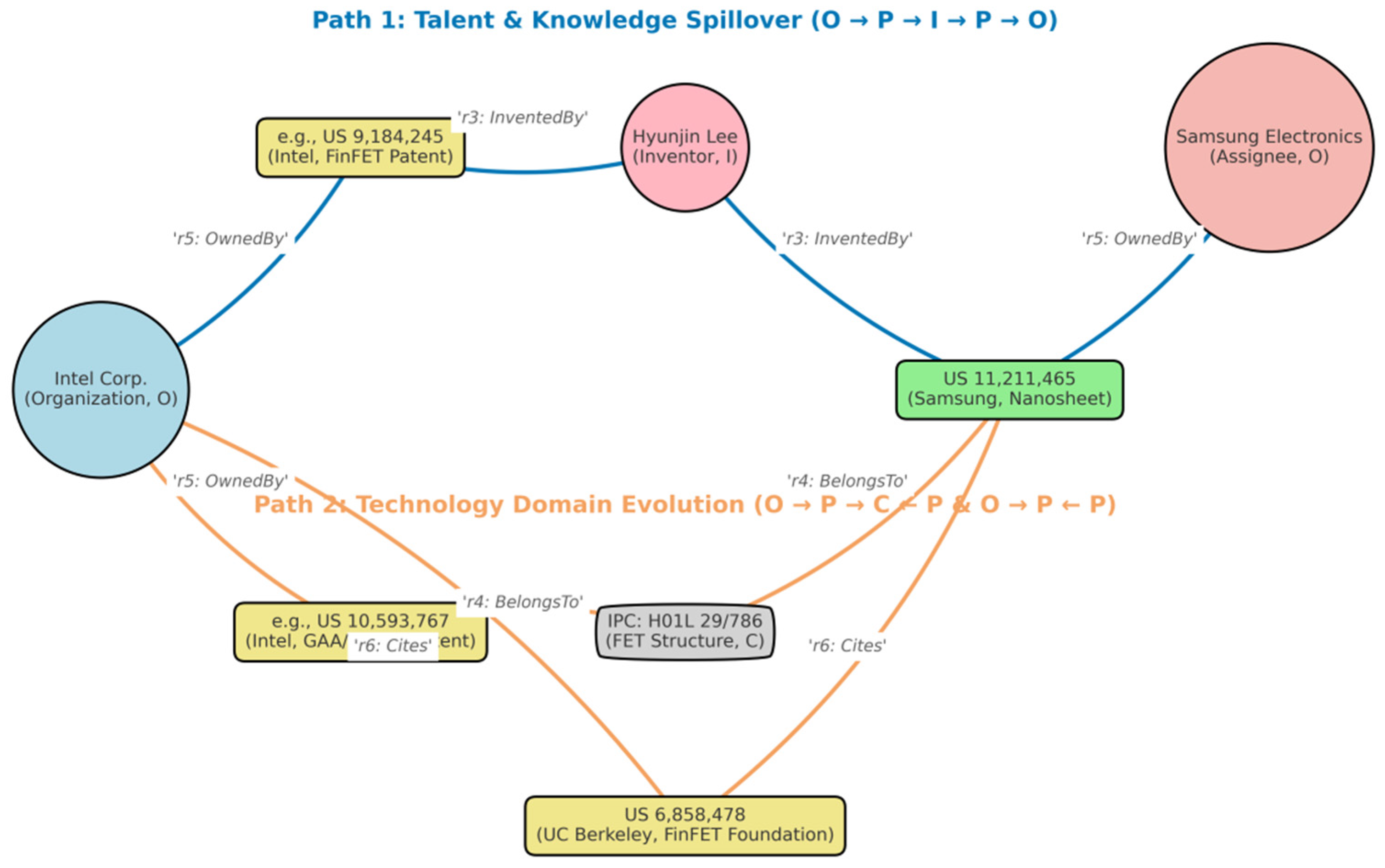 - r5 (OwnedBy): Represents the ownership link between a patent and its assignee, (p, r5, a).