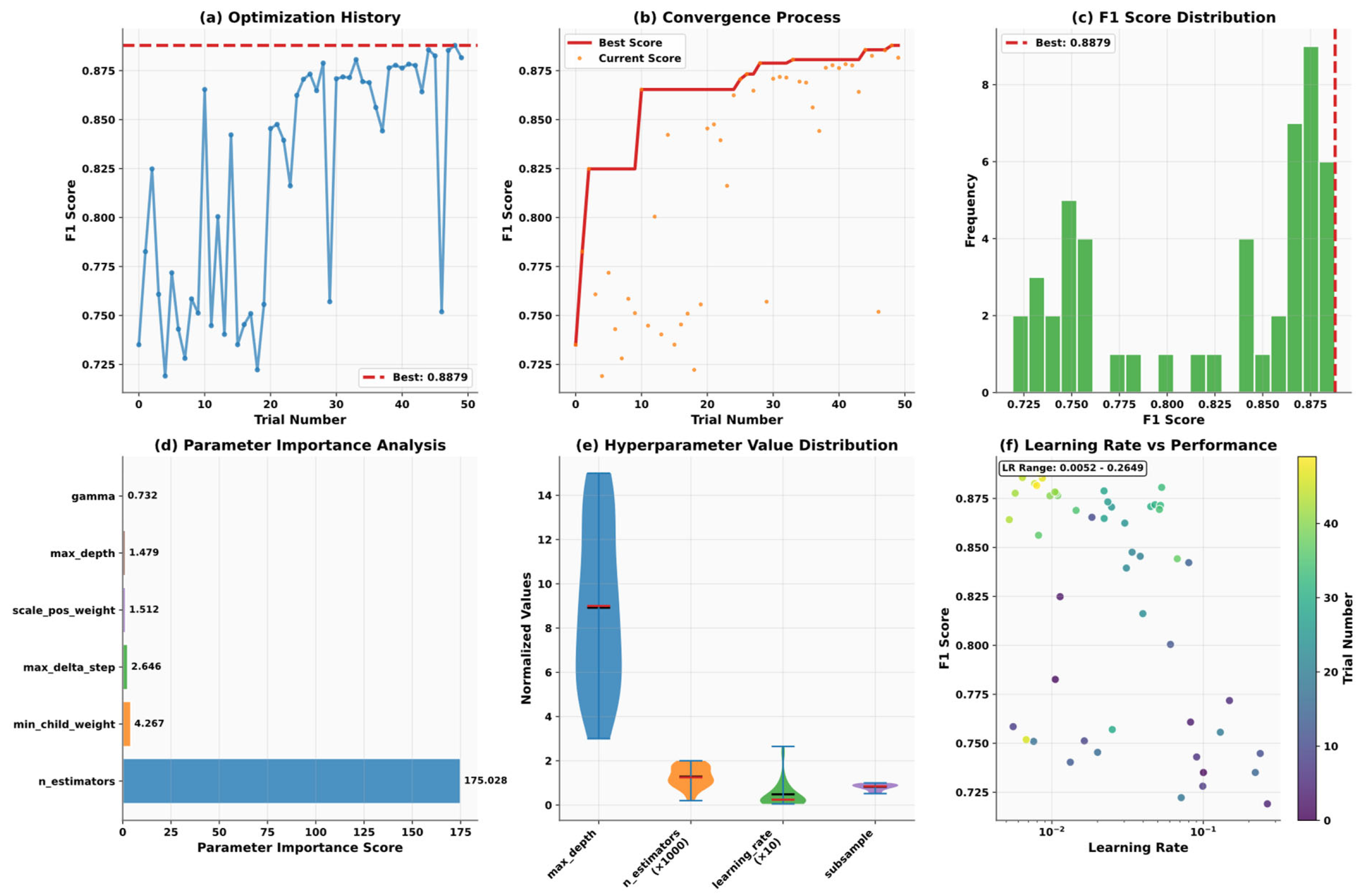 | Hyperopt | 0.9141 | 0.9106 | 0.8950 | 0.9020 | 0.8727 | 0.8721 | 0.9709 | 0.8797 | 0.0144 | −0.0344 | 50 |