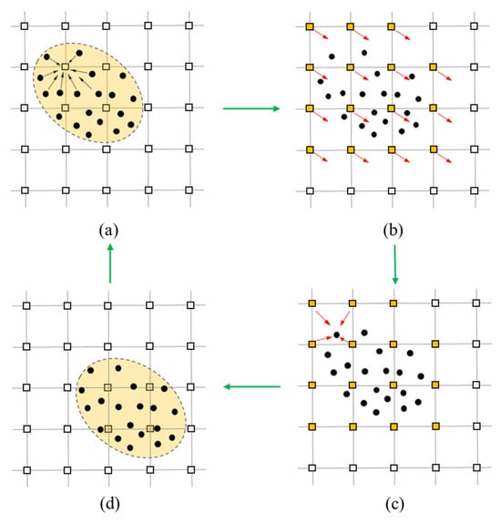 Illustrations of the computational process of MPM. (a) Particle to background mesh; (b) solution on the background mesh; (c) update particle; (d) mesh to particle. Red arrows represent physical quantity mapping calculations, and green arrows represent transformations of computational steps.