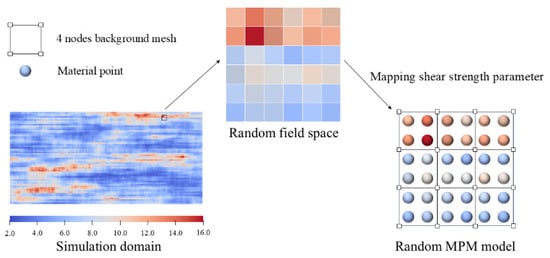 Finally, a nodal averaging algorithm [42] is employed to map the soil parameter information from the element centers to each material point, as shown in Figure 4, thereby obtaining a material point-based random field model.