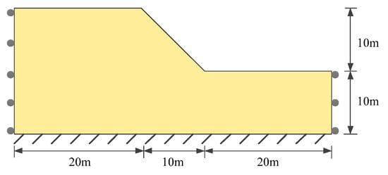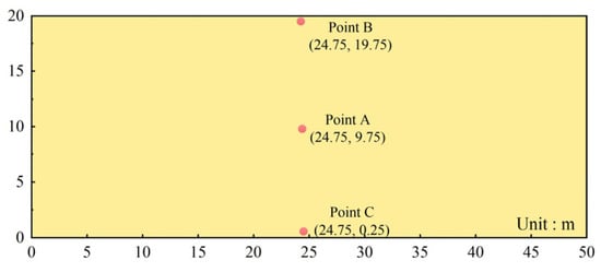 To validate the applicability of the random field method used in this study, a stratigraphic model was constructed with the dimensions shown in Figure 5. The model has a height of 20 m and a width of 50 m and is discretized into 4000 grid cells and 16,000 particles. The soil properties and corresponding statistical parameters are listed in Table 1. Three grid-center locations are selected as monitoring points: A (24.75, 9.75), B (24.75, 19.75), and C (24.75, 0.25). Using the CMD approach, 10,000 random field realizations for both cohesion and internal friction angle are generated, and the values at the monitoring points are subsequently analyzed to verify the accuracy of the proposed method.