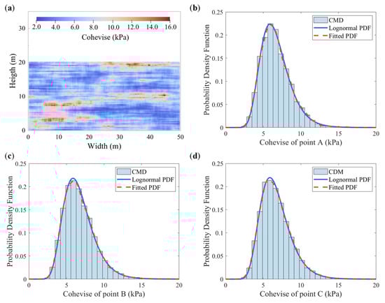 Figure 6a illustrates a typical spatial distribution of the random field for cohesion, which exhibits clear position-dependent variability. Figure 6b–d show the probability density functions (PDFs) of cohesion at monitoring points A, B, and C, respectively. The blue curves represent log-normal distribution functions defined by the mean and standard deviation listed in Table 2, while the red curves are fitted to the sampled random field data. The close agreement between the fitted PDFs and the theoretical log-normal distributions at all three points confirms that the autocorrelation structure of the cohesion random field is well preserved.