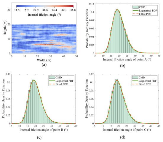 Figure 7a shows the spatial distribution of the internal friction angle for the same random field sample presented in Figure 6, which also demonstrates pronounced spatial variability. Figure 7b–d display the probability density functions (PDFs) of the internal friction angle at monitoring points A, B, and C, respectively. The blue curves represent log-normal distributions defined by the mean and standard deviation provided in Table 2, while the red curves correspond to fitted distributions based on the random field sample data. The close agreement between the fitted PDFs and the theoretical log-normal curves validates that the autocorrelation structure of the internal friction angle field is well preserved.