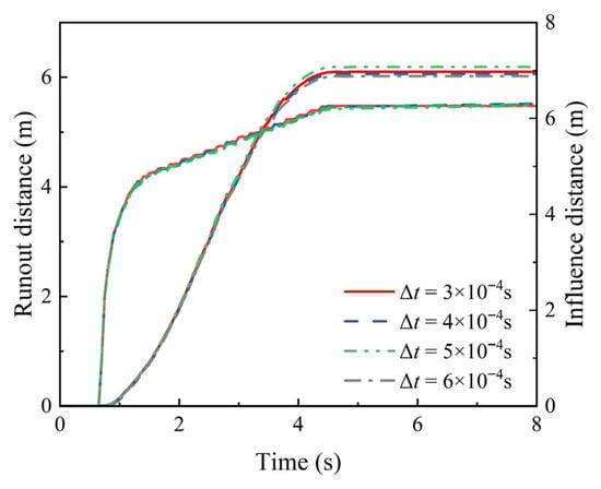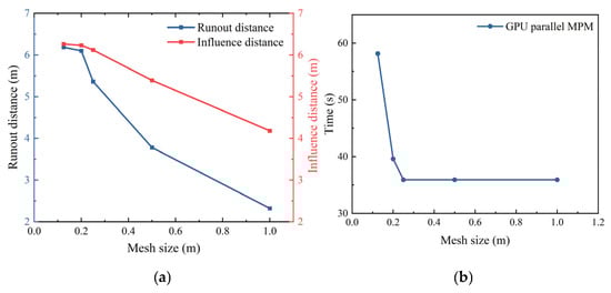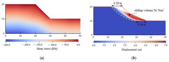 To validate the impact of the single and double precision on the results of large deformation slope analysis, a comparative analysis was conducted using a model with a mesh size of 0.2 m × 0.2 m. The soil parameters are presented in Table 6. Figure A1 presents a comparison of the single precision type (SPT) and double precision type (DPT) results from the deterministic slope model. The solid and dashed lines in Figure A1a represent the results for the large deformation characteristics of the slope using DPT and SPT, respectively. It can be observed that the two sets of results show a high degree of agreement. Additionally, the post-failure behavior is also highly consistent between the two data types, as shown in Figure A1b. This indicates that the difference in data types has a limited impact on the simulation results of the large deformation of the slope.