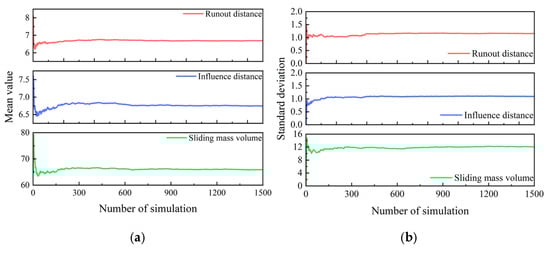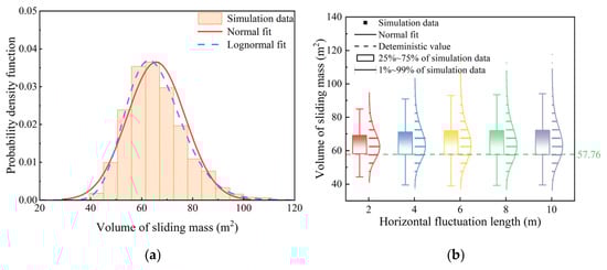 Figure A2 illustrates the distribution of large deformation characteristics in the random field slope and the deterministic analysis results. In this example, the mean cohesion of the soil is reduced to 6.0 kPa. Compared with the results from the example in the main text, the large deformation characteristics of the slope in the deterministic calculation show an increase. The median of the large deformation characteristics in the sample data remains higher than the deterministic results. The exceedance probabilities for sliding mass volume, sliding distance, and affected area are 76.47%, 77.33%, and 56.46%, respectively. This indicates that the underestimation of landslide hazard risk by deterministic analysis is a relatively common issue.
