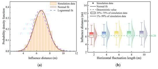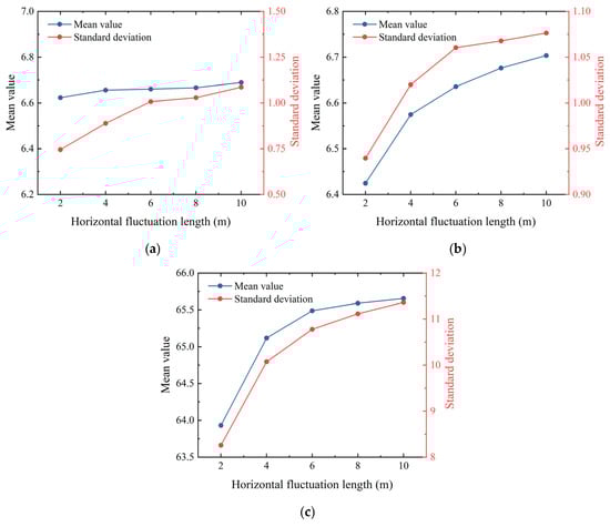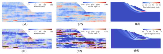 Furthermore, the distribution in Figure 7a exhibits a clear negative correlation with the cohesion distribution in Figure 6a; regions of higher cohesion correspond to lower internal friction angles, and vice versa. This observation aligns with the predefined cross-correlation coefficient of −0.5 between the two parameters, confirming that the proposed random field approach effectively captures the interdependence between cohesion and internal friction angle.