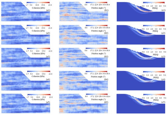 Typical realizations of random fields of cohesion, friction angle, and equivalent plastic strain fields. (a1–c1) Random field of cohesion, friction angle, and equivalent plastic strain fields with R c,φ = −0.5, (a2–c2) Random field of cohesion, friction angle, and equivalent plastic strain fields with R c,φ = −0.25, (a3–c3) Random field of cohesion, friction angle, and equivalent plastic strain fields with R c,φ = 0.0, (a4–c4) Random field of cohesion, friction angle, and equivalent plastic strain fields with R c,φ = 0.25, (a5–c5) Random field of cohesion, friction angle, and equivalent plastic strain fields with R c,φ = 0.5.