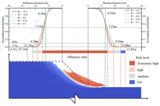 A set of parameters was adopted for the instance analysis of spatial variability: COVs for soil cohesion and internal friction angle of 0.3 and 0.2, respectively, a horizontal fluctuation scale of 20, a vertical fluctuation scale of 2, and Rc,φ between the two parameters varying across −0.5, −0.25, 0.0, 0.25, and 0.5. Figure 24 illustrates the exceedance probability curves for the landslide runout and influence distance corresponding to the random field slope. The figure simultaneously highlights the potential hazard zones based on the classification standards. Each curve approximately represents the exceedance probability of the landslide failure impacting structures at different distances from the slope crest (Is) or slope toe (Rs). The results indicate that the probability P (I > Is) decreases with increasing distance from the crest, and P (R > Rs) decreases with increasing distance from the toe. Notably, the slope failure tends to form a wider influence zone and constitute a higher hazard level when the soil cohesion and internal friction angle exhibit a positive correlation, which is evidenced by the higher exceedance probabilities observed at the same Is or Rs distances.