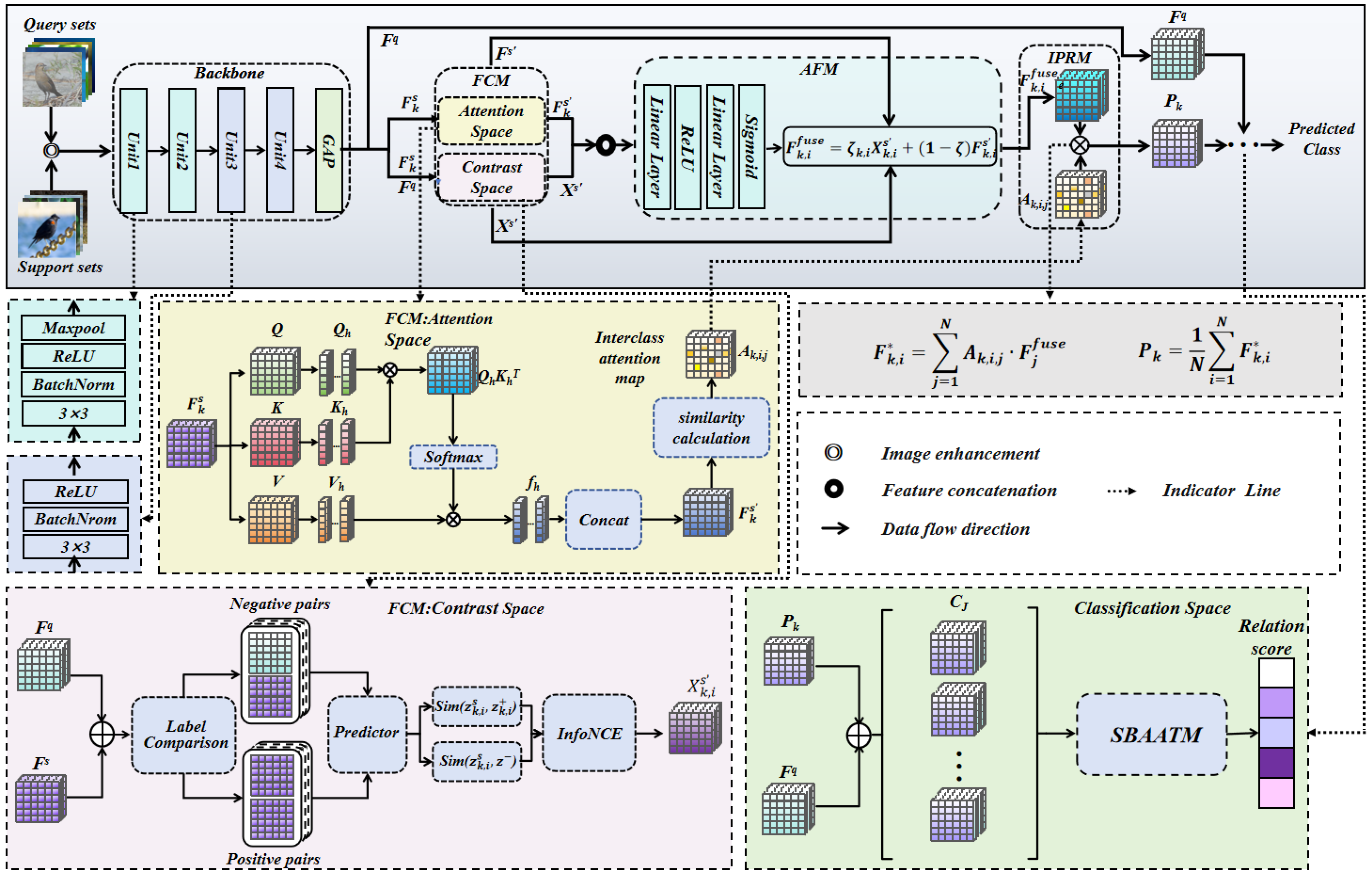 - We propose FC-SBAAT, a unified framework that jointly designs feature collaboration, prototype rectification, and attention-based matching and establishes an information-flow coupling from prototype rectification to relevance-bias construction and sparse selection. The rectified prototypes directly shape the matching bias and determine the sparse aggregation scope, enabling coupled optimization between prototype construction and relation matching and improving accuracy, robustness, and generalization under noisy Few-Shot prototypes and complex inter-class relations.
