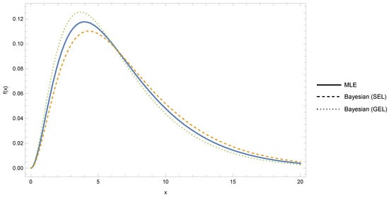 As illustrated in Figure 8, the PDF curves using MLE, SEL, and GEL estimations are almost the same, with slight distinctions only in the early parts of the distribution. This tight fit indicates the strength of the TWED fit and proves that both the Bayesian and classical analysis methodologies provide consistent inferences to the HIV survival data.