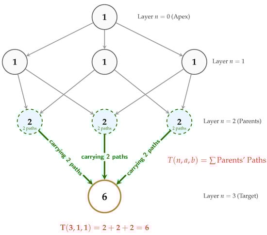 The recurrence relation admits a natural graph-theoretic interpretation. If we view the Pascal Pyramid as a directed graph where each element at layer n is connected to its three “parent” elements in layer , then equals the number of distinct paths of length n from the apex to the position . As illustrated in Figure 2, this path-counting perspective provides an alternative combinatorial understanding and illuminates connections between different theorems.