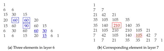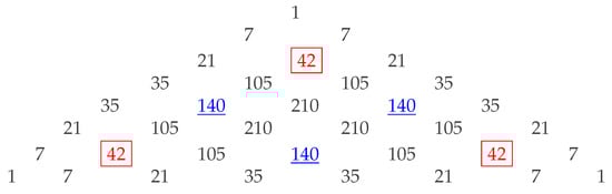 - Chen, S. Properties and Applications of Pascal’s Triangle and Pascal’s Pyramid. Theor. Nat. Sci. 2025, 84, 36–39. [Google Scholar] [CrossRef]
