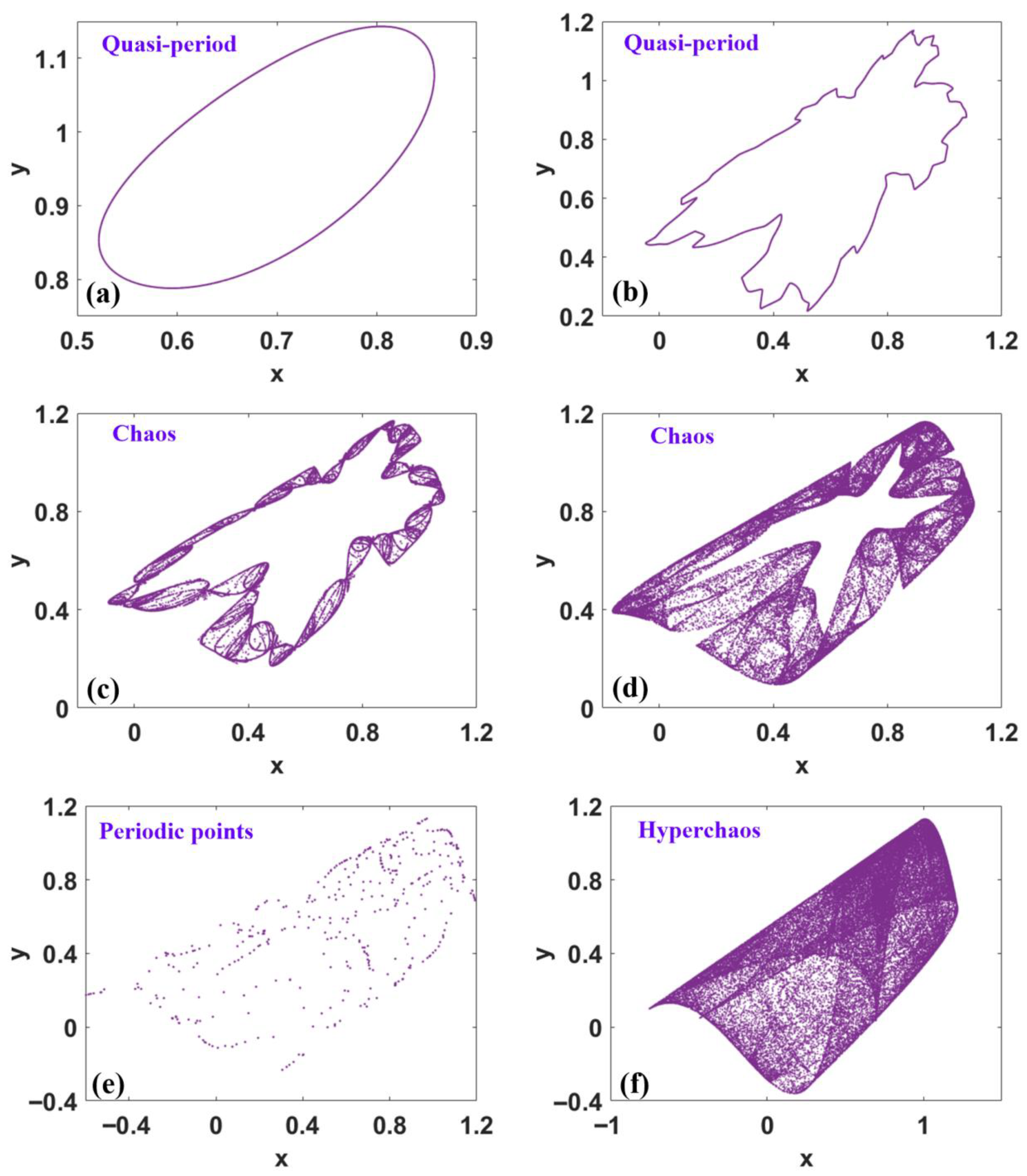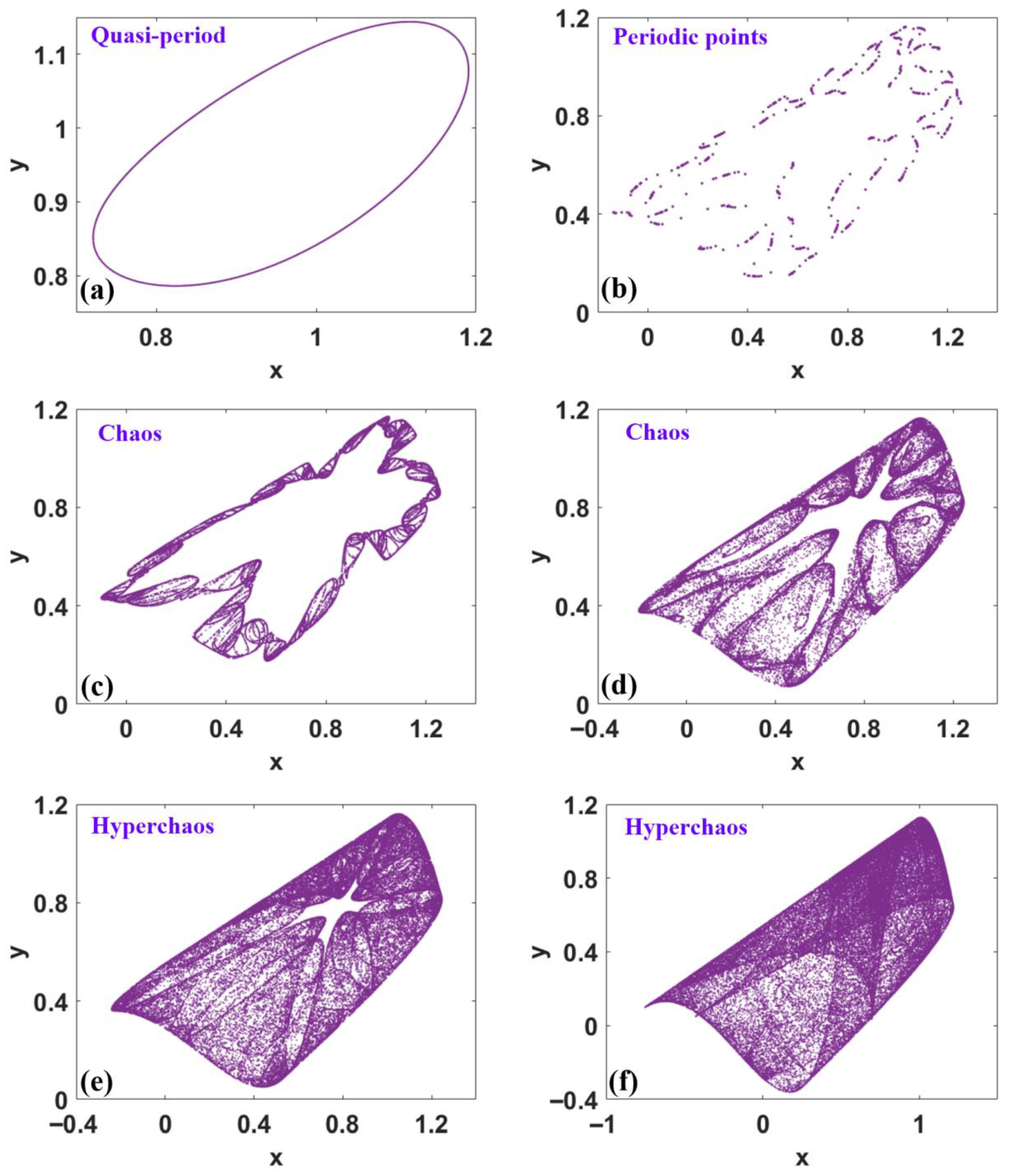 - Rossler, O.E. An equation for hyperchaos. Phys. Lett. A 1979, 71, 155–157. [Google Scholar] [CrossRef]
