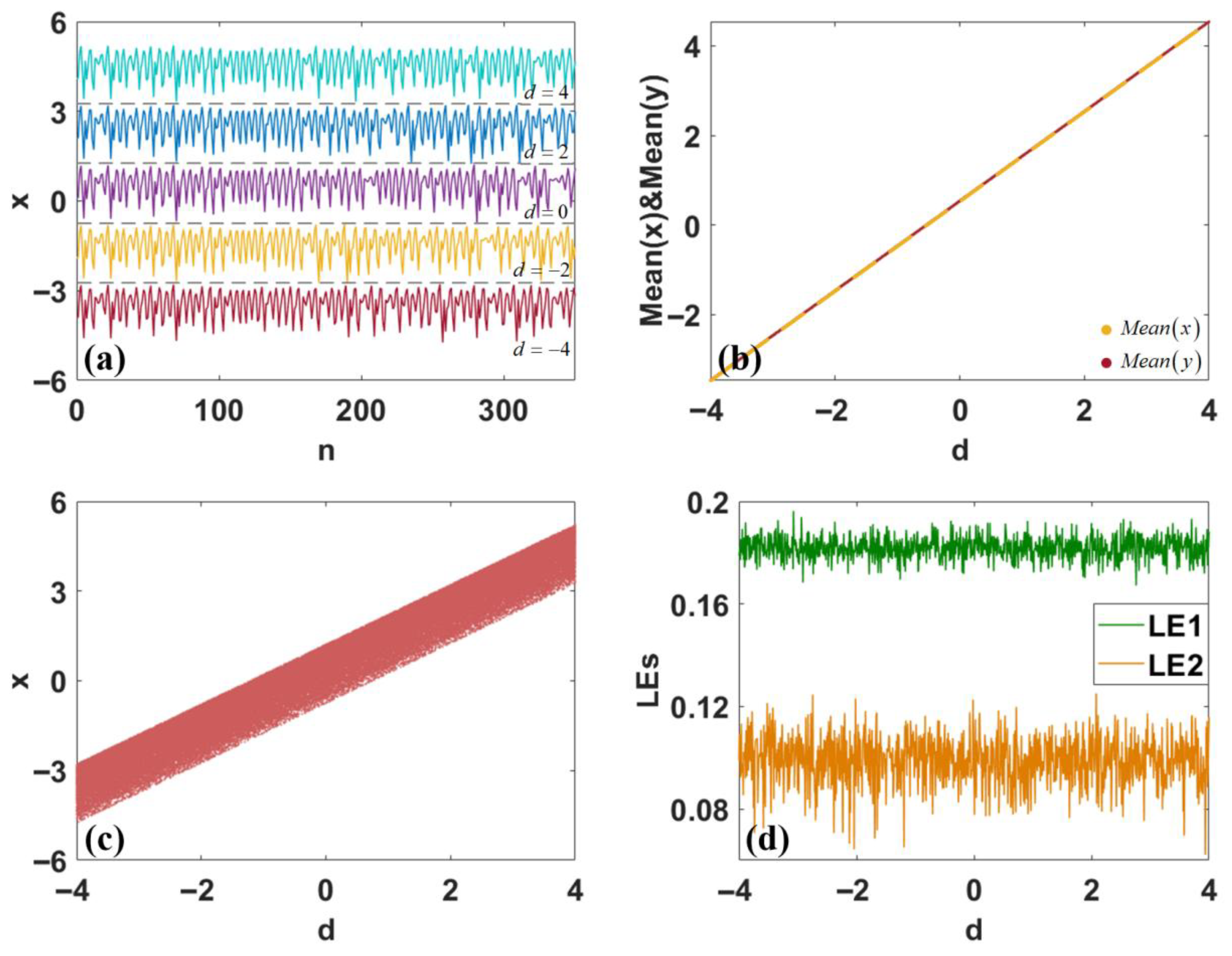 - The proposed discrete hyperchaotic map has an elegant structure hosting two-dimensional offset boosting, where a single constant rescales the average values of all variables simultaneously.