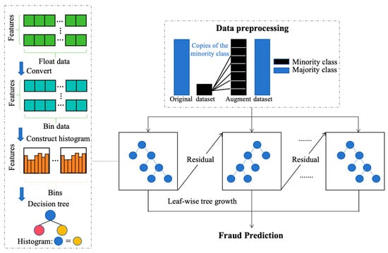 LightGBM is an efficient implementation of Gradient Boosting Decision Trees. Its engineering features—histogram-based learning, leaf-wise tree growth, Gradient-based One-Side Sampling, and Exclusive Feature Bundling—make it both computationally efficient and effective on tabular data. LightGBM supports categorical features and allows scale/weighting mechanisms to handle class imbalance, making it well-suited to fraud detection tasks when combined with appropriate data engineering. Its objective, mathematical background, and training procedure are provided below Algorithm 2.