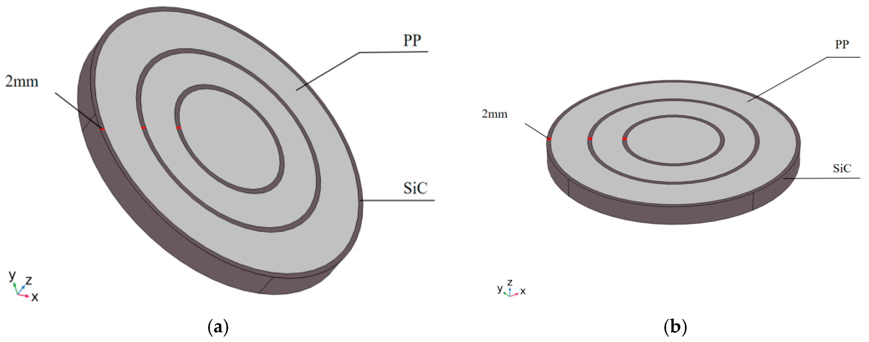 - Microwave energy with a frequency of 2.45 GHz was fed into the bottom of a standard symmetrical circular waveguide. The horn and slot radiating antenna structure were continuously optimized, such that the microwave energy was amplified through the horn structure and then uniformly radiated into the polypropylene plastic in the reaction chamber via the slot array antenna. Meanwhile, two cylindrical through-holes were arranged on the side of the reaction chamber, serving as dedicated gas inlets and outlets.
