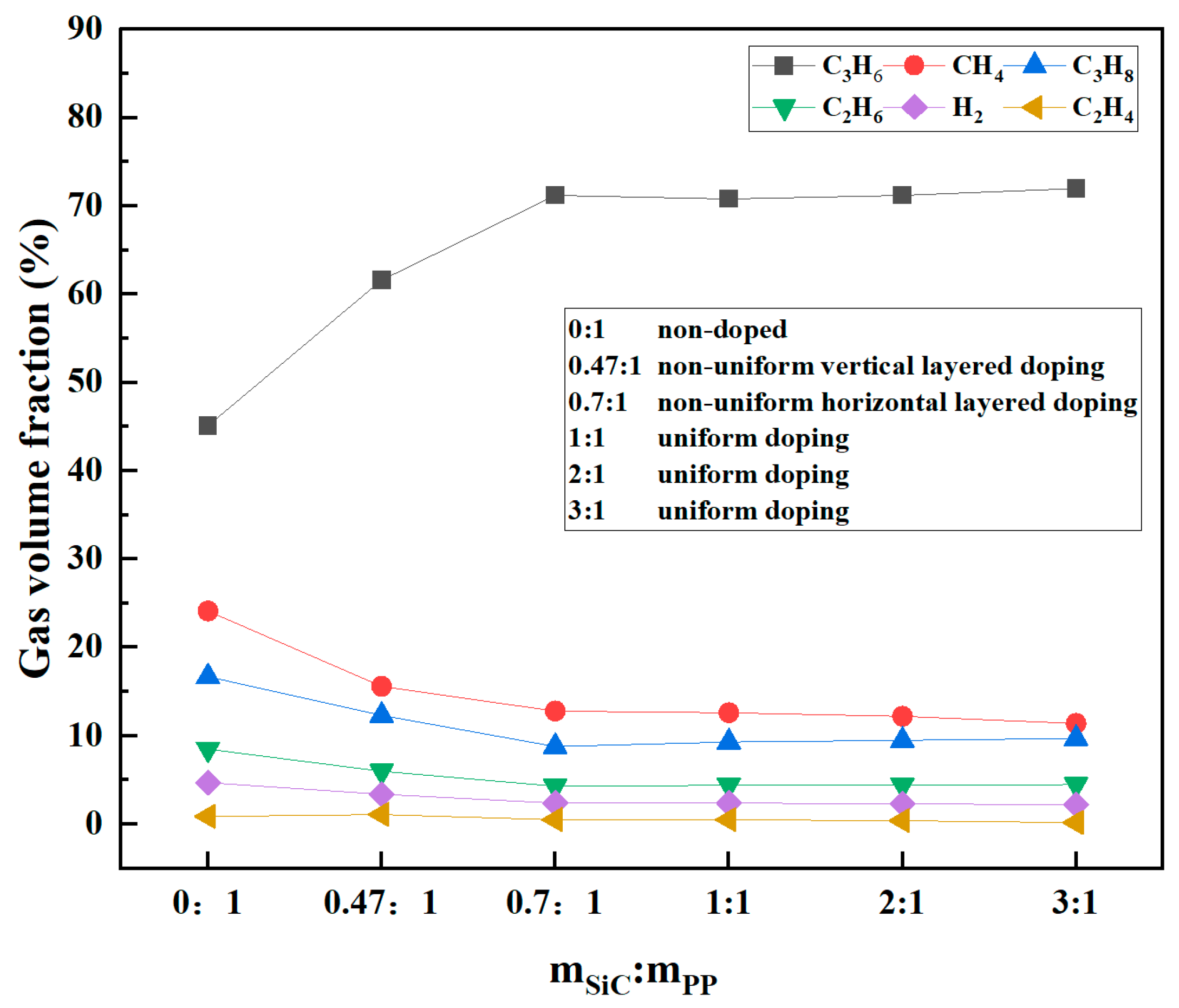 3.2. The Influence of SiC Doping Method on Pyrolysis Effect of Polypropylene Plastic