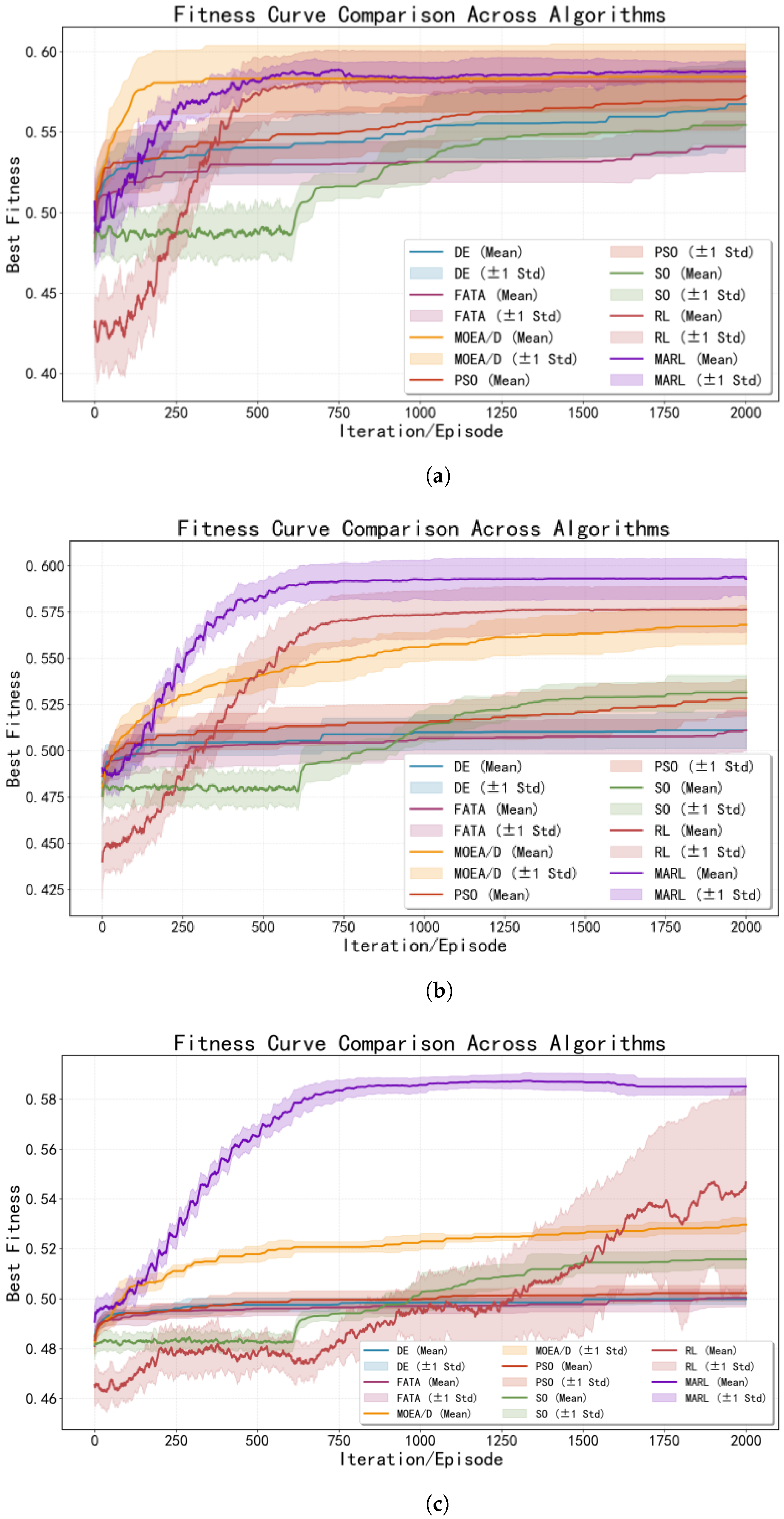 - Medium-scale (S2) scenario: As the solution space dimension increases, MARL’s average convergence iteration count rises to 772 (only 31 more than S1, a <5% increase), showing good scalability; its final average fitness further improves to 0.59282 (the only algorithm with increased accuracy in the medium-scale scenario). In contrast, other algorithms either see a sharp increase in iterations (e.g., RL (PPO) rises from 569.4 to 912.4, a 60.2% increase) or a significant drop in accuracy (e.g., DE drops from 0.567525 to 0.511148, a 9.93% decrease), failing to balance efficiency and accuracy. MOEA/D achieves 0.568239 with 106.8 iterations (4.15% lower than MARL); SO maintains 626.8 iterations but only achieves 0.531644 (a large gap from MARL). MARL’s ability to improve accuracy against the trend stems from multi-agent division of labor, which reduces the search complexity of high-dimensional solution spaces and continuously explores high-quality solutions via offline collaborative exploration—avoiding the “efficiency-accuracy trade-off” of traditional algorithms in expanded solution spaces.