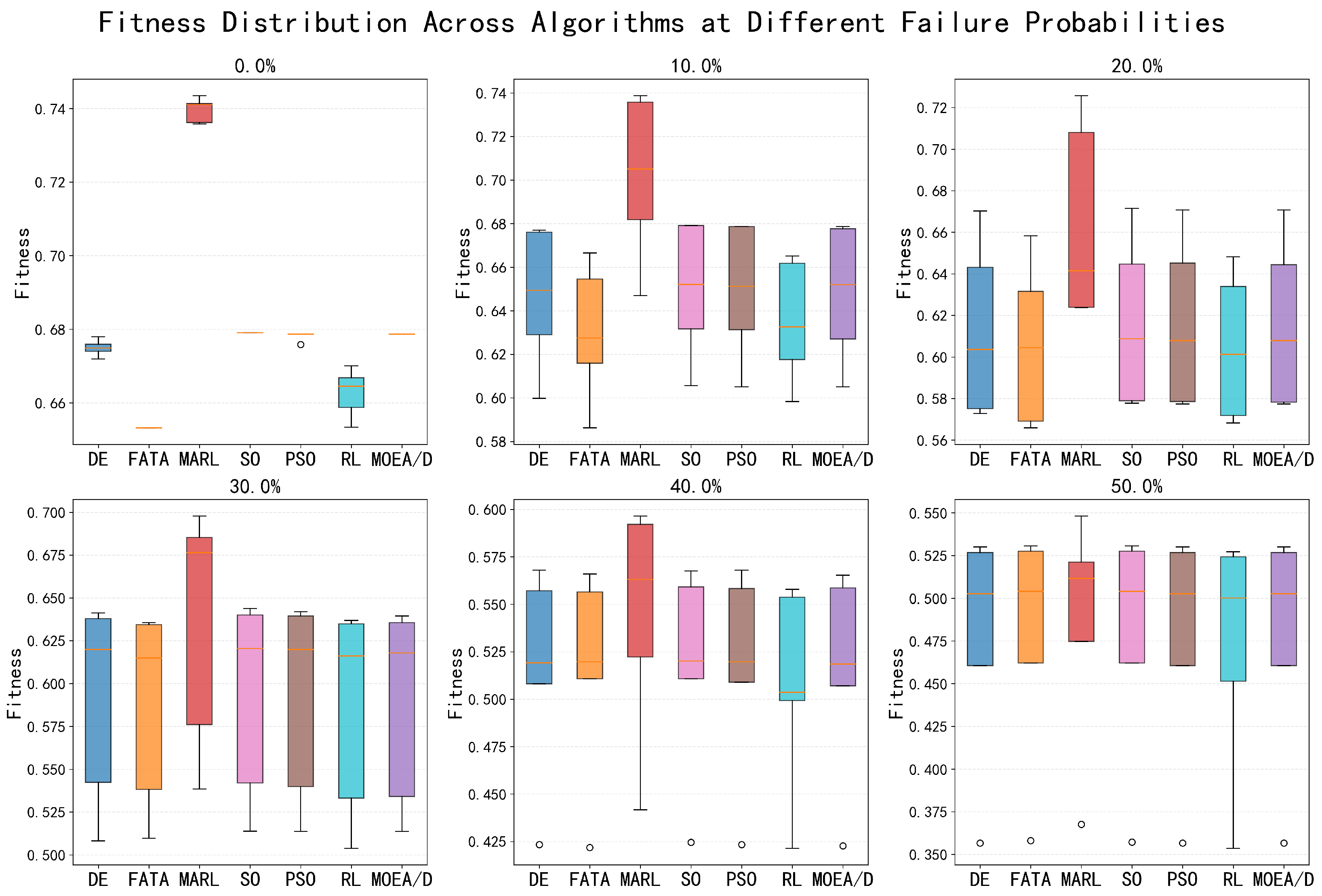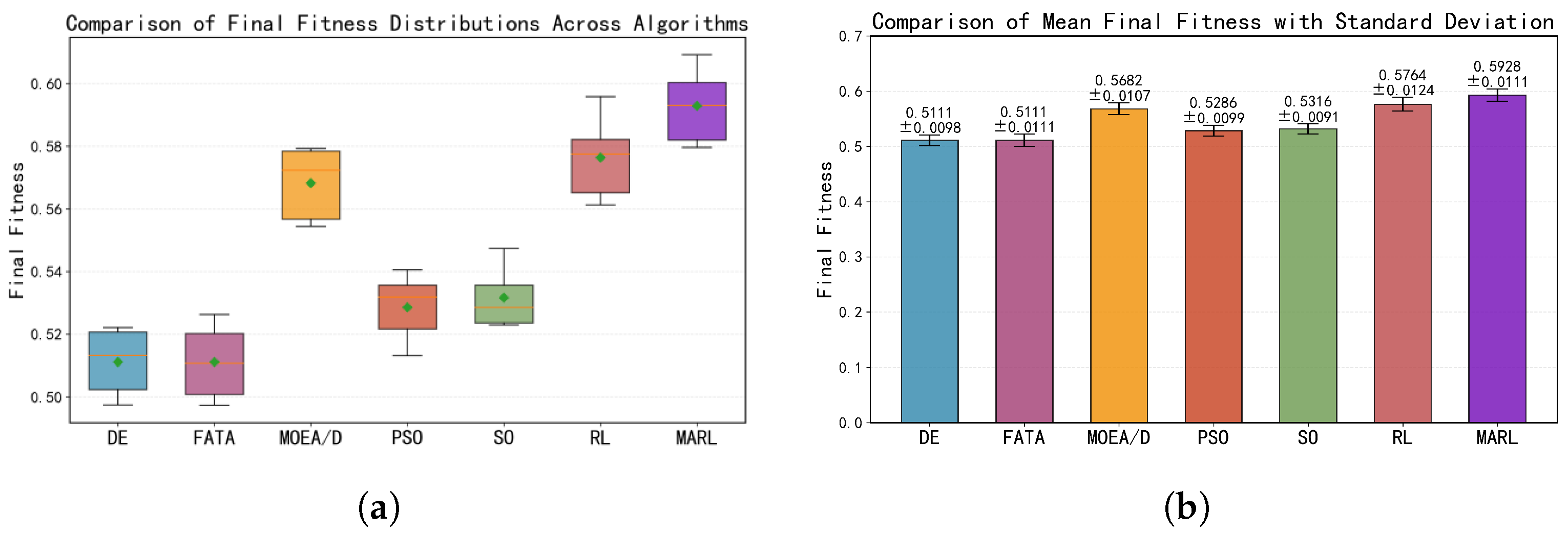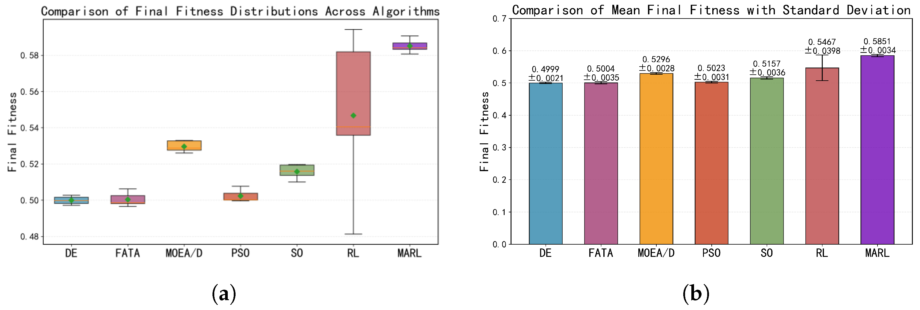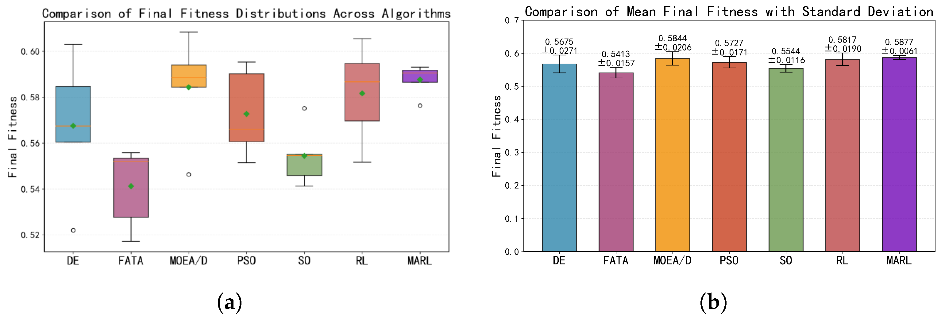 - S3 scenario: Stability differences are more significant: MARL has a standard deviation of 0.003375, a very narrow boxplot (no outliers), and a max–min gap of 0.0099—showing excellent consistency. Competitors’ stability degrades sharply: RL (PPO) has a standard deviation of 0.039822, a wide boxplot, and a range of 0.1129 (highly uncertain); DE, FATA, and PSO have low standard deviations (0.002058–0.003622) but boxplots concentrated in the low-fitness range (“invalid stability” with low accuracy). This indicates that MARL maintains stable optimization in complex solution spaces: dynamic agent collaboration and adaptive strategy adjustment resist the uncertainty of large-scale solution spaces, ensuring reliable offline training results.