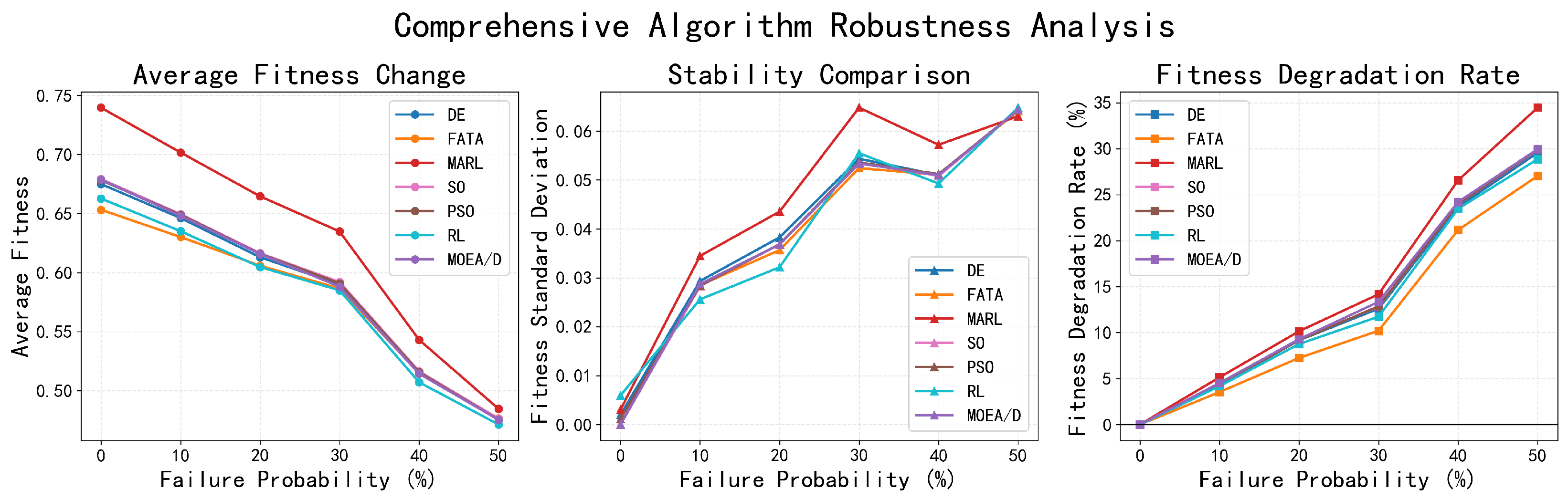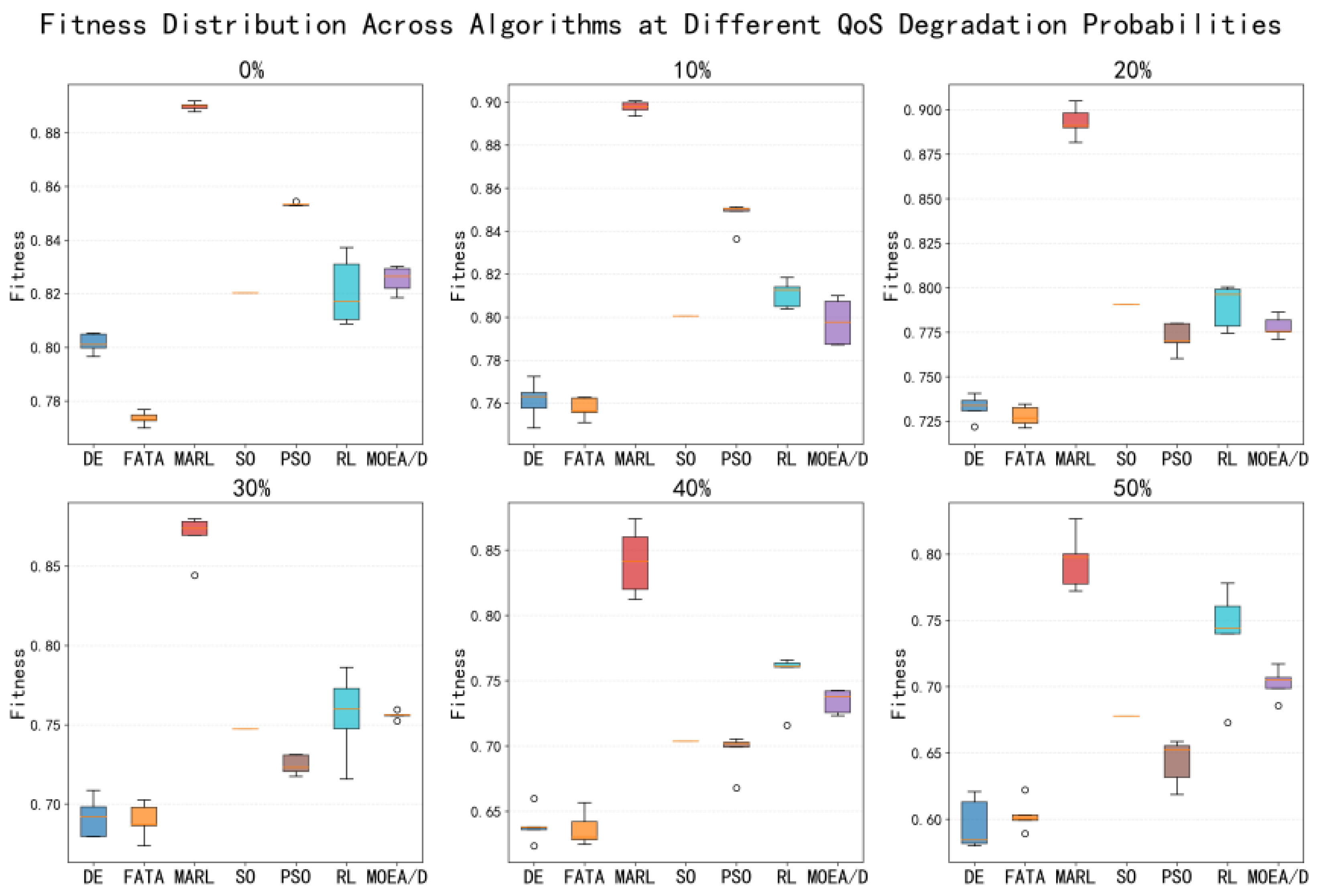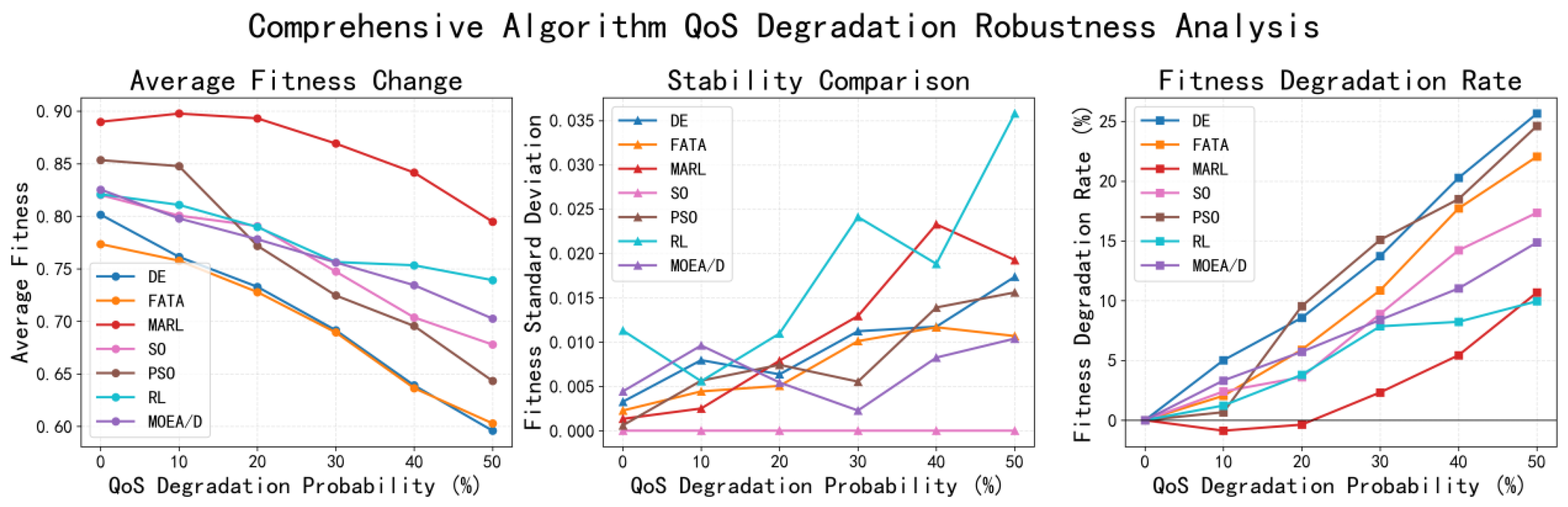 | Algorithm | QoS Degradation Probability (%) | Average Fitness | Standard Deviation | Degradation Rate (%) |