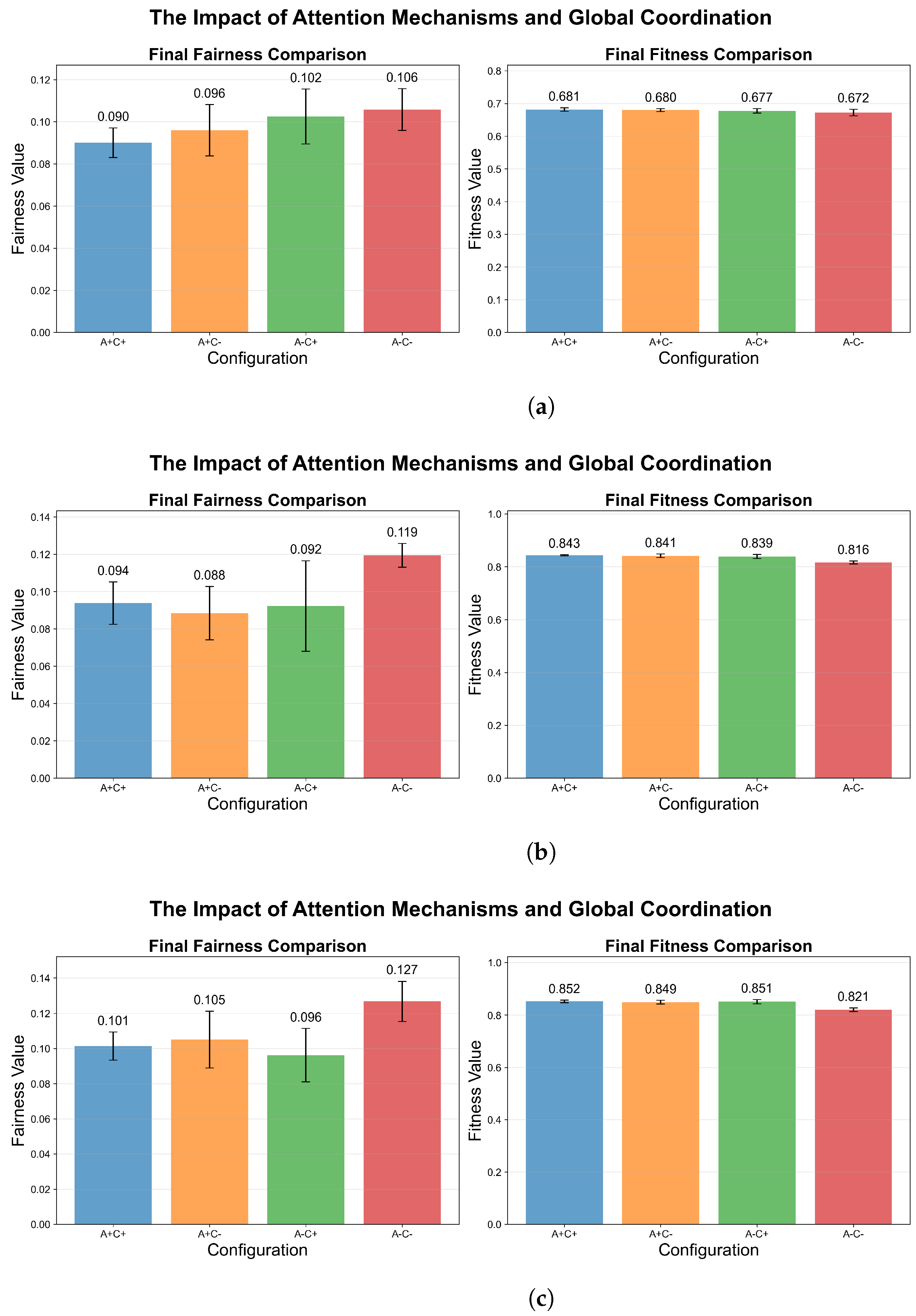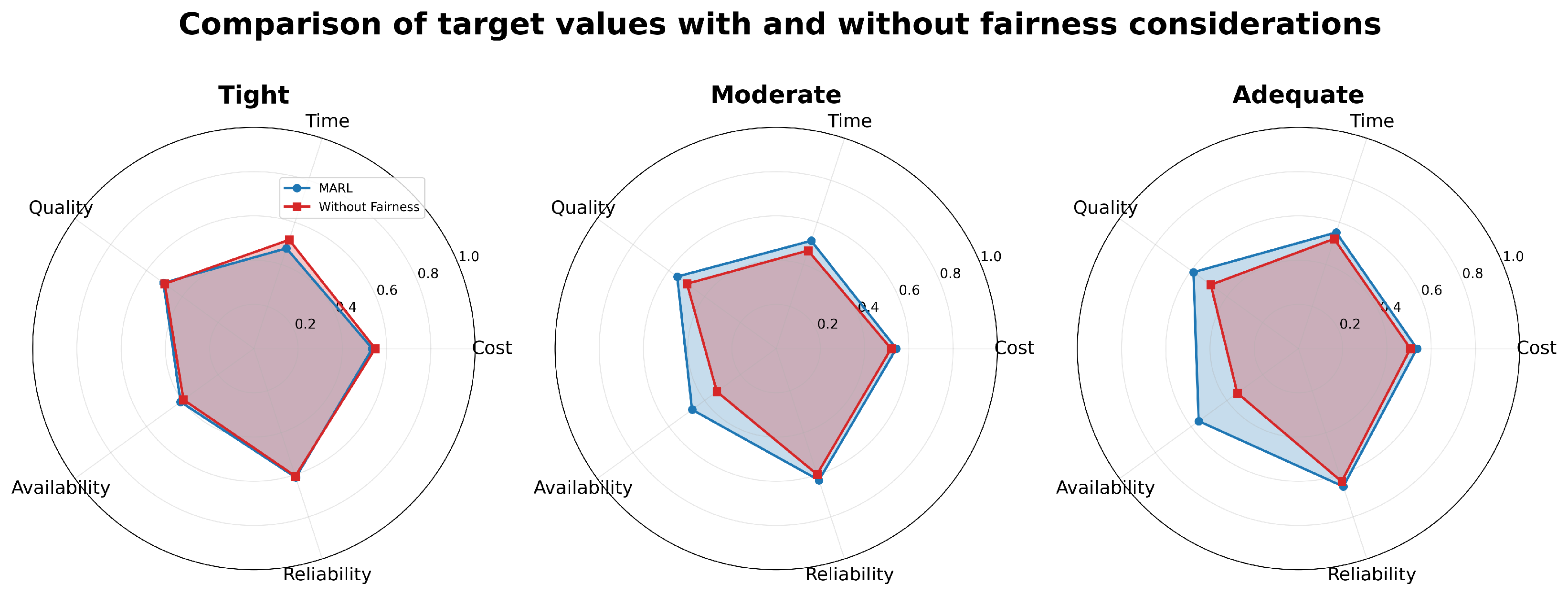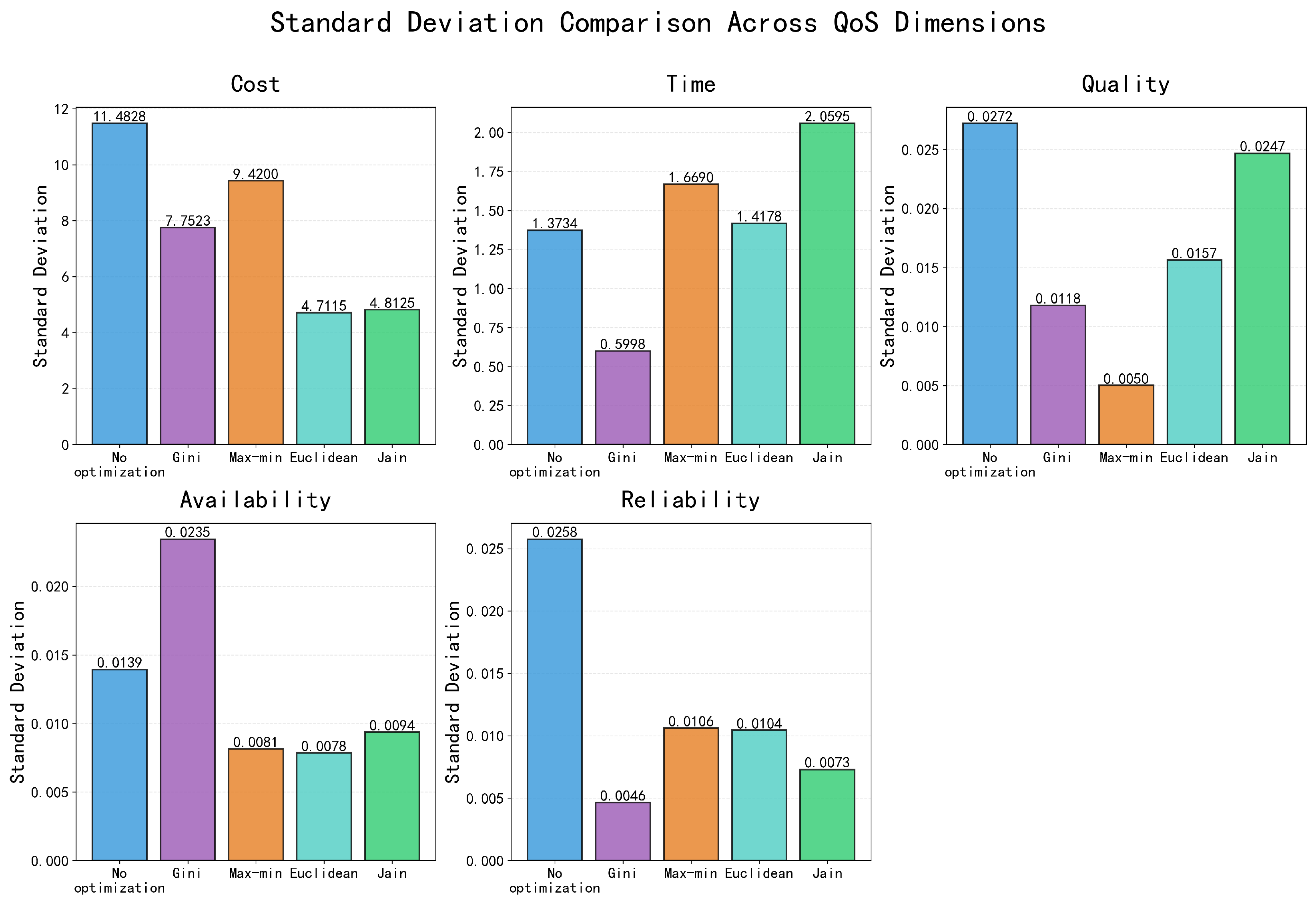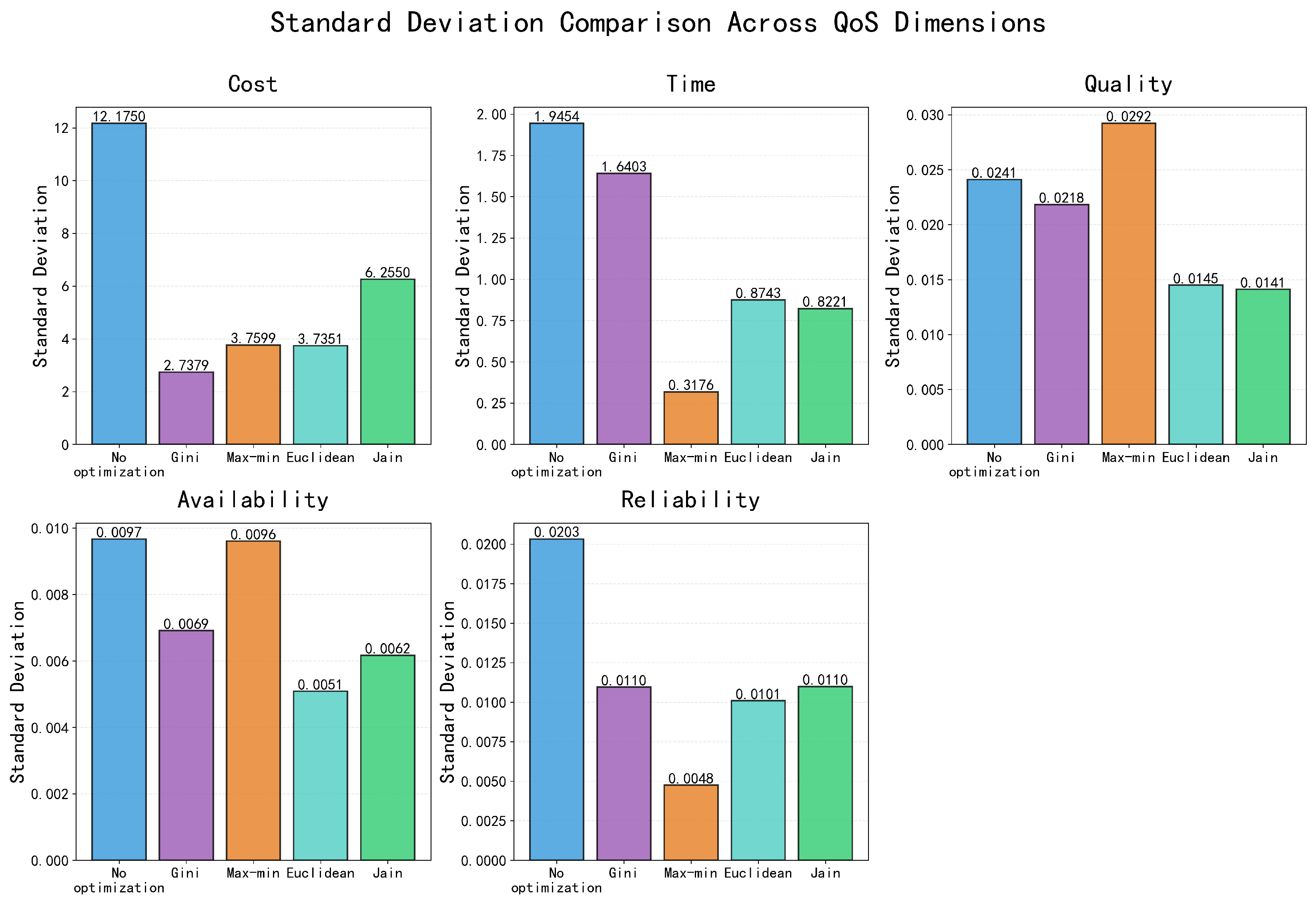 - Max–min fairness focuses on the performance gap between extreme tasks by computing the mean difference between the maximum and minimum values of each QoS dimension, with the formulawhere is the number of QoS evaluation dimensions, and a smaller value indicates a narrower gap between extreme tasks.