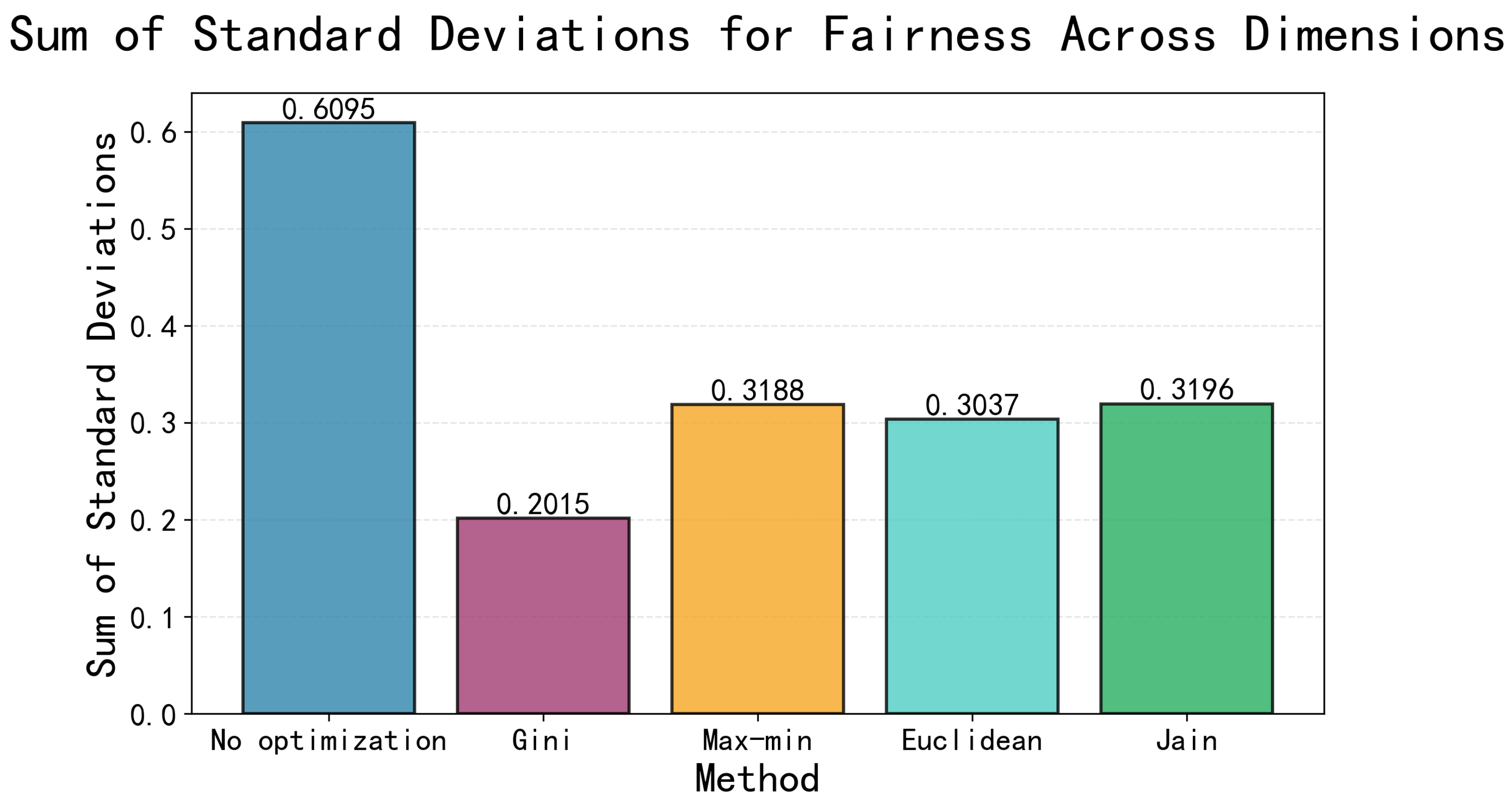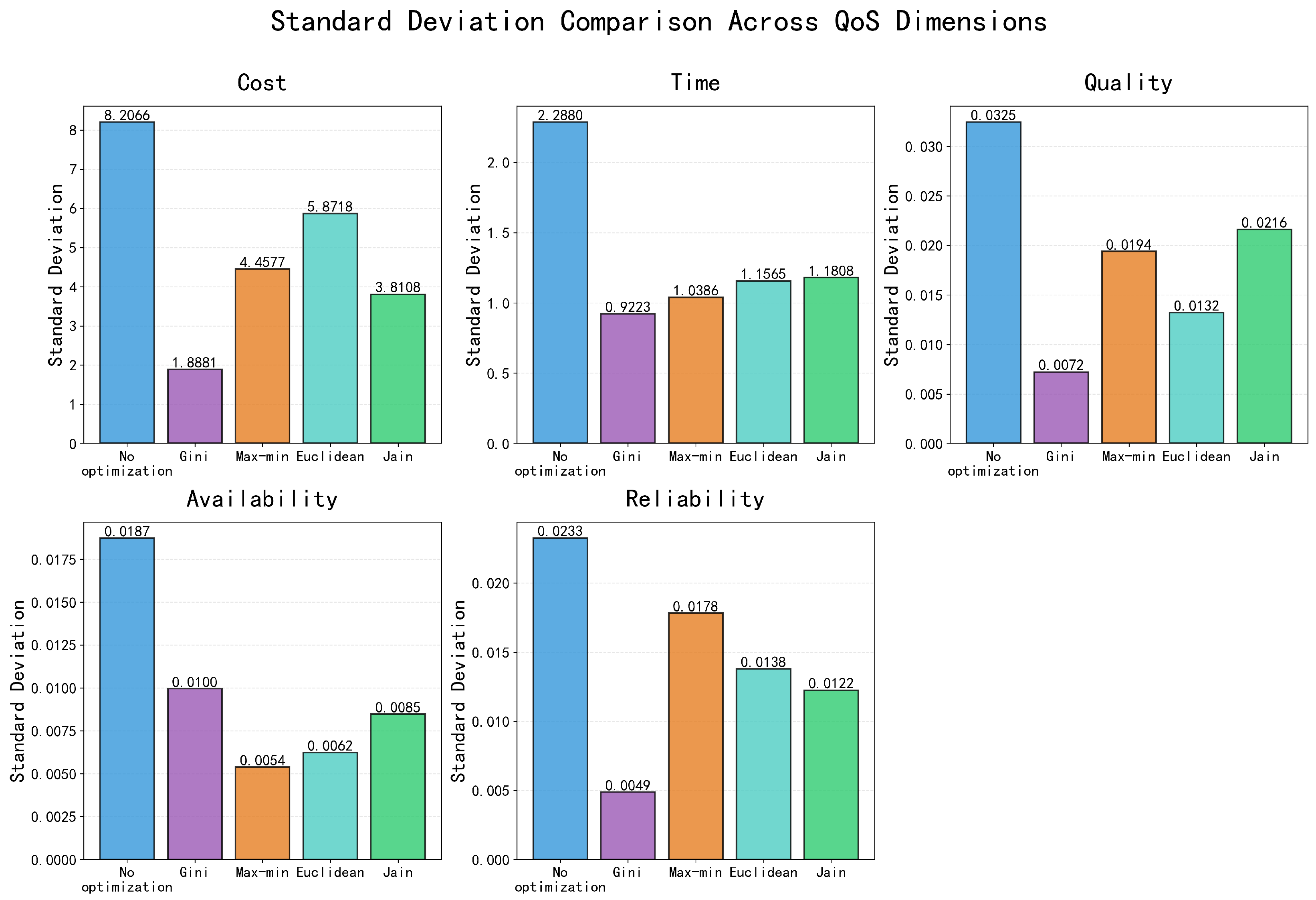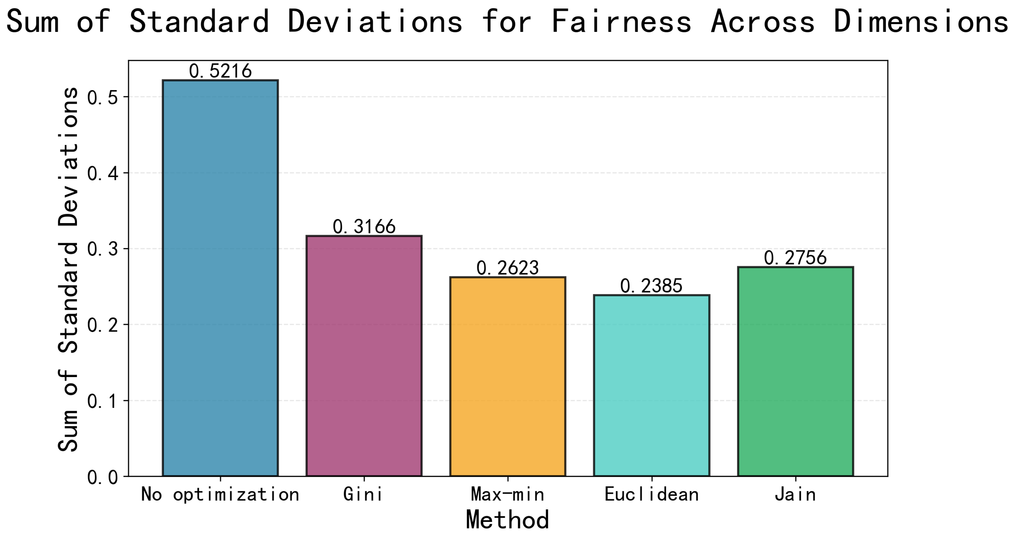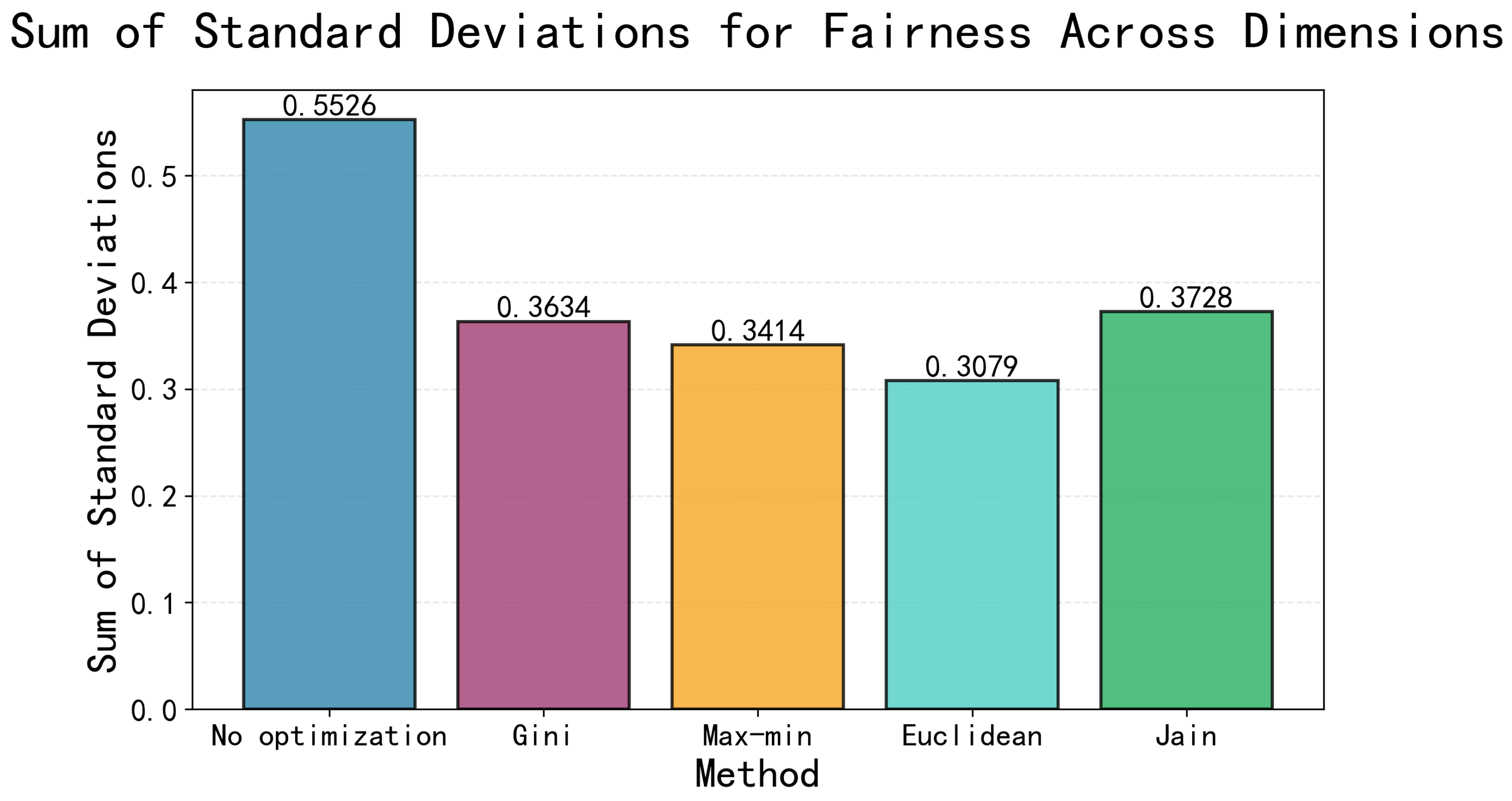 - Euclidean distance measures the global average difference by calculating the mean Euclidean distance of five-dimensional normalized QoS vectors between all MT pairs, with its modeling formula shown in Equation (8) and a smaller value indicating better fairness.