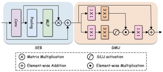 After the SEB, is further processed by the GMU for fine-grained gated feature modulation. As illustrated in Figure 3, is first fed into two parallel branches, where a convolution and a depth-wise convolution are applied, respectively, to capture local spatial contextual information. The convolution focuses on channel-wise transformation and feature projection, enabling efficient channel information reweighting without introducing additional spatial smoothing. In contrast, the depth-wise convolution captures local neighborhood-level structural variations within each channel, providing spatially aware cues for gating while maintaining a favorable balance between spatial sensitivity and robustness. One branch generates transformed feature responses , while the other applies an SiLU activation function to generate the gating signal . The two are then combined through element-wise multiplication, yielding a gated feature map .