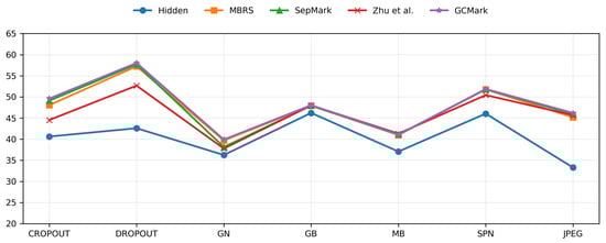 In this section, we conduct distortion-specific training for each of the seven distortion types introduced in Section 4.2, with a dedicated model trained for each individual distortion. This allows for a fair and detailed evaluation of GCMark’s imperceptibility and robustness and the baseline methods under different distortions. Figure 5 presents GCMark’s visual results under various distortions, while Figure 6 reports the quantitative PSNR comparisons between GCMark and the baseline approaches.