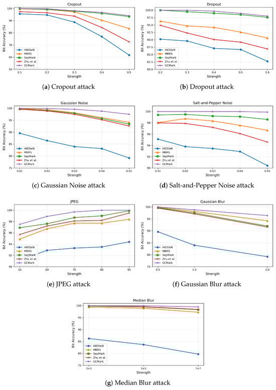 Dropout: During training, a dropout ratio of 0.4 is employed, while during evaluation, it is varied from 0.2 to 0.6 to assess model performance under different distortion strengths. Under pixel dropout attacks, GCMark demonstrates strong resilience to partial information loss. As reported in Figure 6, the proposed method achieves higher PSNR values than the baseline approaches, indicating improved imperceptibility. Furthermore, as illustrated in Figure 7b, GCMark maintains stable extraction accuracy even when a substantial portion of pixels is removed, validating its robustness against random pixel removal.