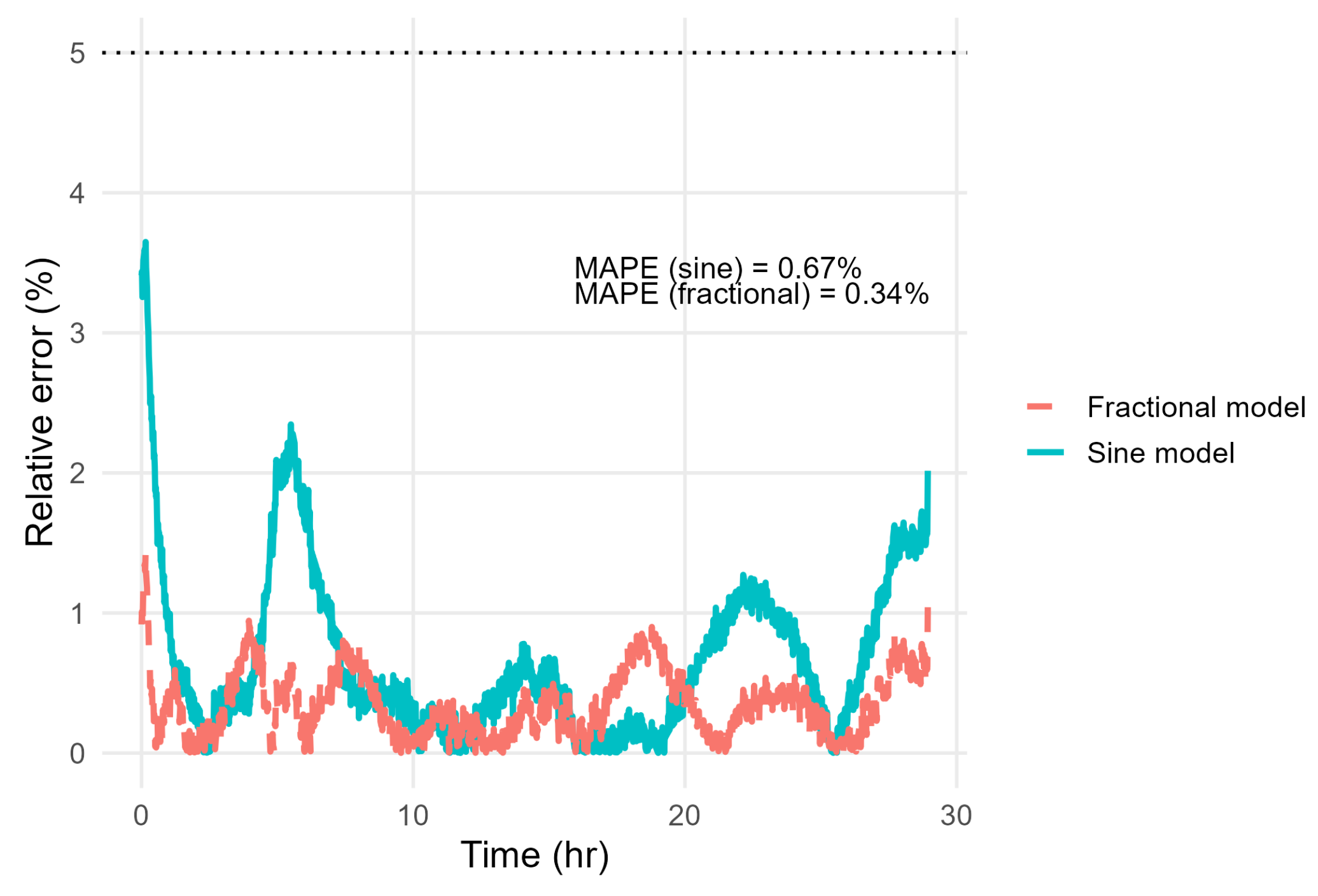 Figure 4 demonstrates the superior performance of the sinusoidal model formulated with the fractional power
