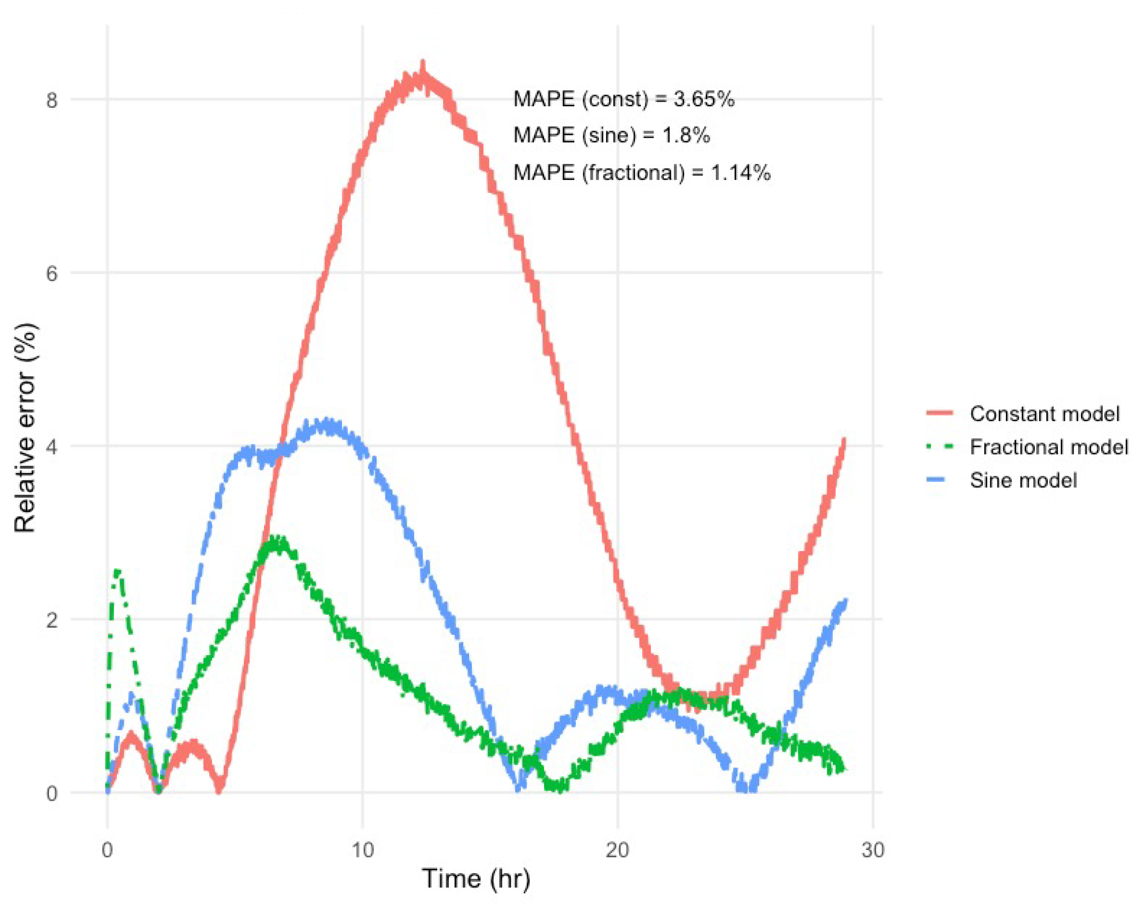 Figure 7, the constant model exhibits the largest error (MAPE = 3.65%), the sine model achieves a better approximation (MAPE = 1.8%), and the conformable model attains the lowest error (MAPE = 1.14%). These results confirm that the conformable model more accurately represents the long-term behavior of the system, due to the flexibility introduced by the fractional time variable