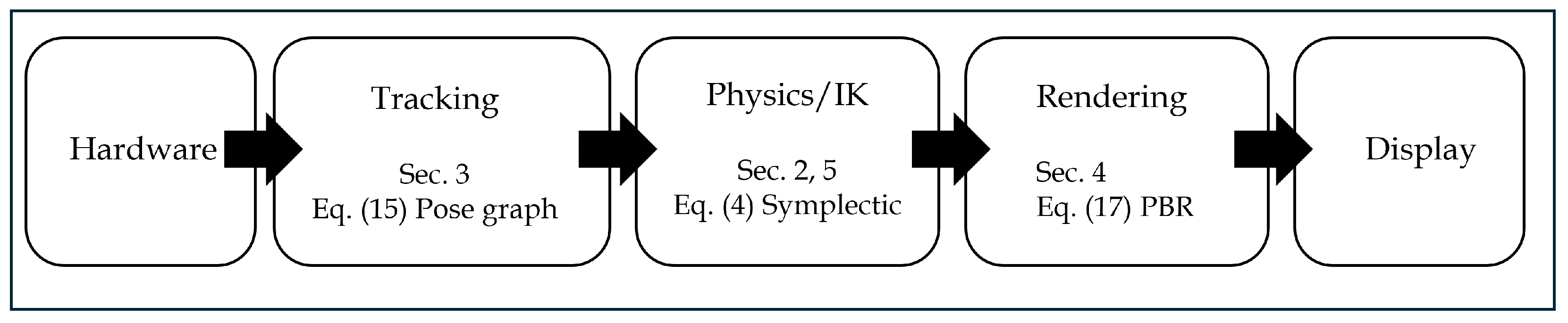 Figure 1 summarizes the simplified VR system pipeline considered in this survey (hardware → tracking → physics/IK → rendering → display) and maps each block to the corresponding sections and representative equations. In particular, we later illustrate the numerical stability of the physics update in