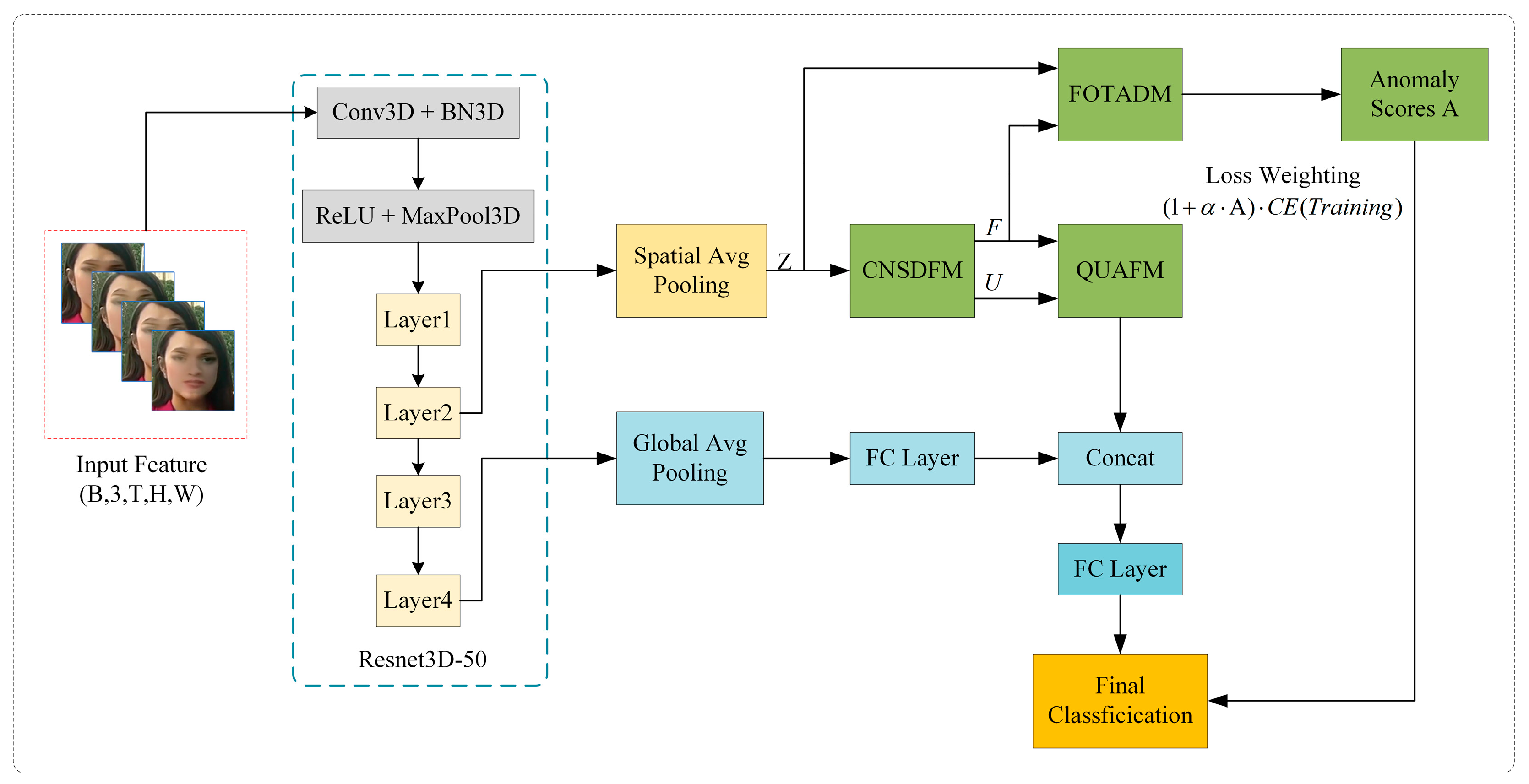 and outputs refined temporal representations F along with frame-level uncertainty estimates U; (2) QUAFM takes both F and U as inputs, constructing density matrices to perform uncertainty-aware feature fusion; and (3) FOTADM computes frame-wise anomaly scores A from the residuals between original and refined features. During training, the anomaly scores serve as dynamic weights in the loss function (Equation (17)). During inference, the fused features from QUAFM are concatenated with global features from the backbone and passed through fully connected layers for final classification.